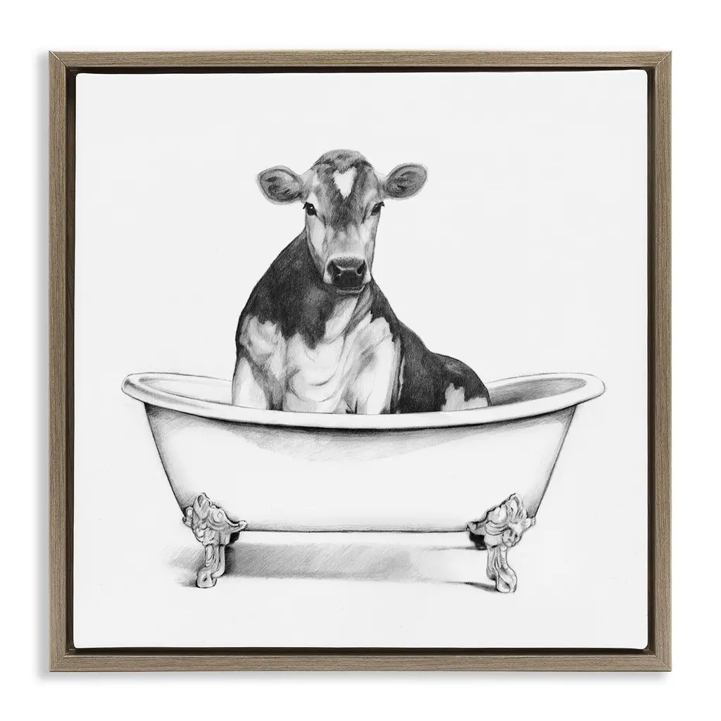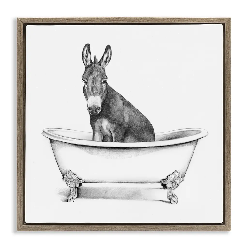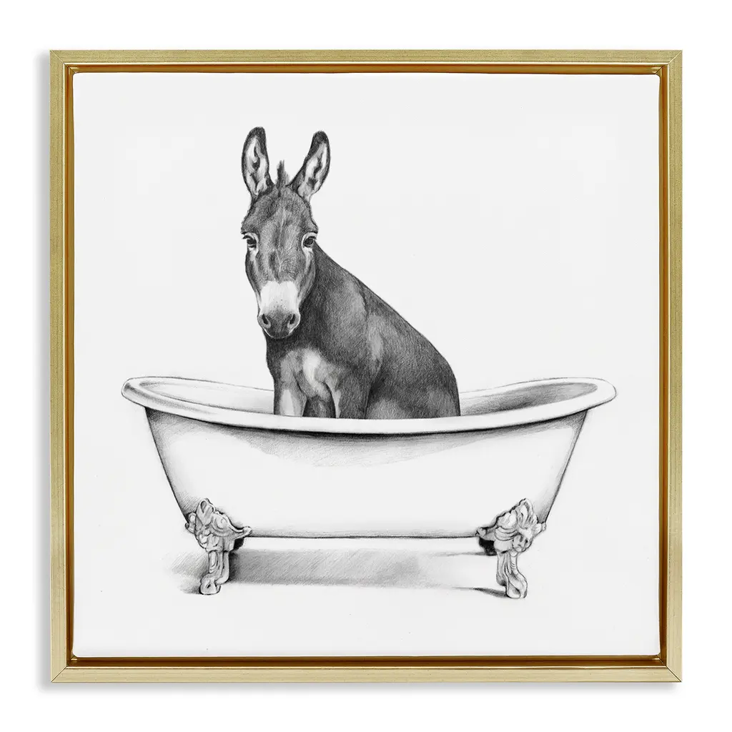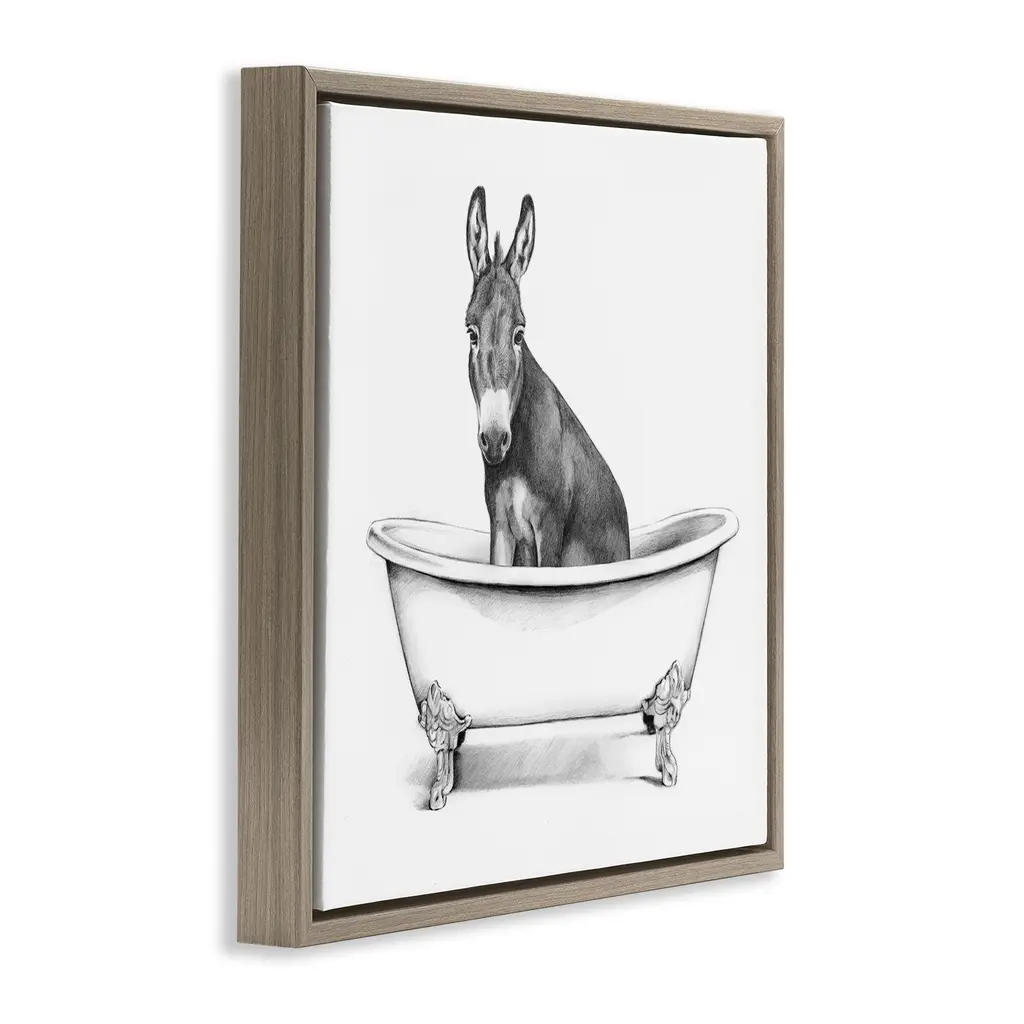 Elevate your home or office to the next level with Stupell Framed Floating Canvas Wall Art. Our premium hand-stretched canvas is mounted securely into a sturdy lightweight frame. The museum-style gap between the wrapped canvas and the box frame gives the illusion of floating artwork. Stupell Wall Art is made in the USA.Features: Dimensions: 18 x 1.7 x 18 Frame, 17 x 1.5 x 17 Canvas ArtFloating Frame Canvas Products are available in sizes 18"x18" and 25"x25". All Floating Frame Canvas Products have a 1.7" Depth.Wall Art is Ready to Hang with Hardware Free Hanging. No Installation required. For Easy Set Up Lean or Layer Artwork on Shelf or Against Wall. Artwork is Permently Fixed into the Frame.Our elevated 1.7" Thick Floating Frame is the perfect complement to our canvas style Wall Art. We use only the highest quality inks in house with industry leading printing solutions. Canvas is hand stretched over a durable wood foundation and then mounted securly into a Modern Box Frame. Made in the USA.Artwork Relates To: Bathroom, Bathtub, Animal, DonkeyDesign by Victoria Borges