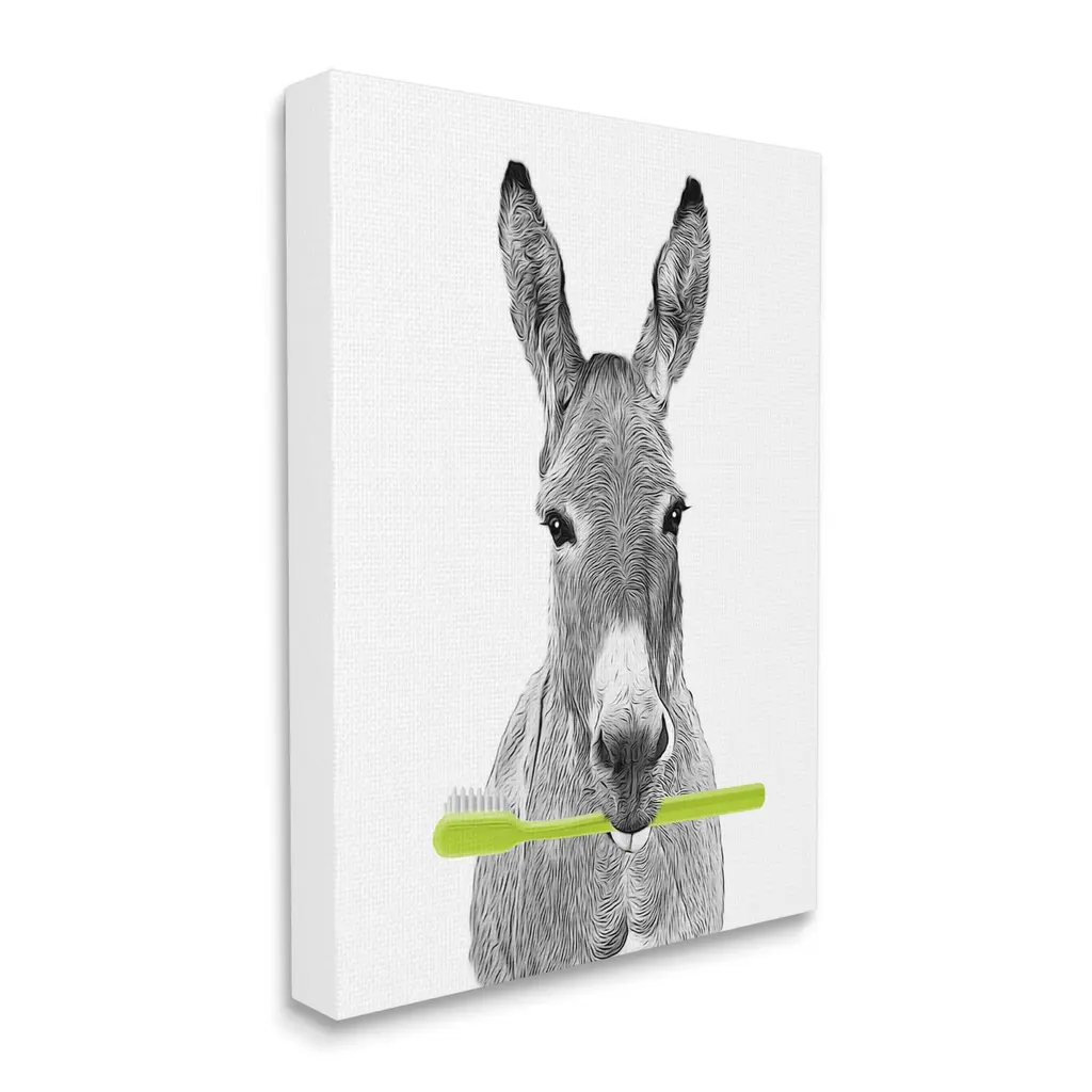 We create our stretched canvas to the highest standards. Using only the highest quality inks and canvas on Mimaki printers, we hand-cut and stretch each piece over a 1.5-inch thick wooden frame for hanging. As a result, the art comes ready to hang on the sturdy ledge with no installation required. Stupell Wall Art is made in the USA.Features: Dimensions: 16 x 1.5 x 20 InchesStretched Canvas Sizes Include Standard: 16 x 1.5 x 20 Large: 20 x 1.5 x 30 X-Large: 30 x 1.5 x 40 Oversized: 36 x 1.5 x 48Wall Art is Ready to Hang - No Installation or Hardware Needed. For Easy Set Up Lean or Layer Artwork on Shelf or Against Wall.Our stretched canvas is created with the highest standards. We use only the highest quality inks and canvas on our in house Mimaki printers, and then hand cut and stretch each piece over a 1.5 inch thick wooden frame for hanging. Made In USA.Artwork Relates To: Animal, Mammal, Wildlife, Bathroom, DonkeyDesign by Annalisa Latella