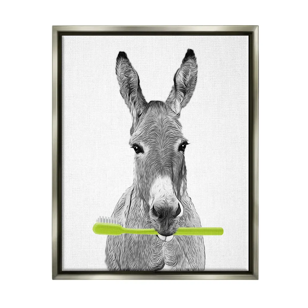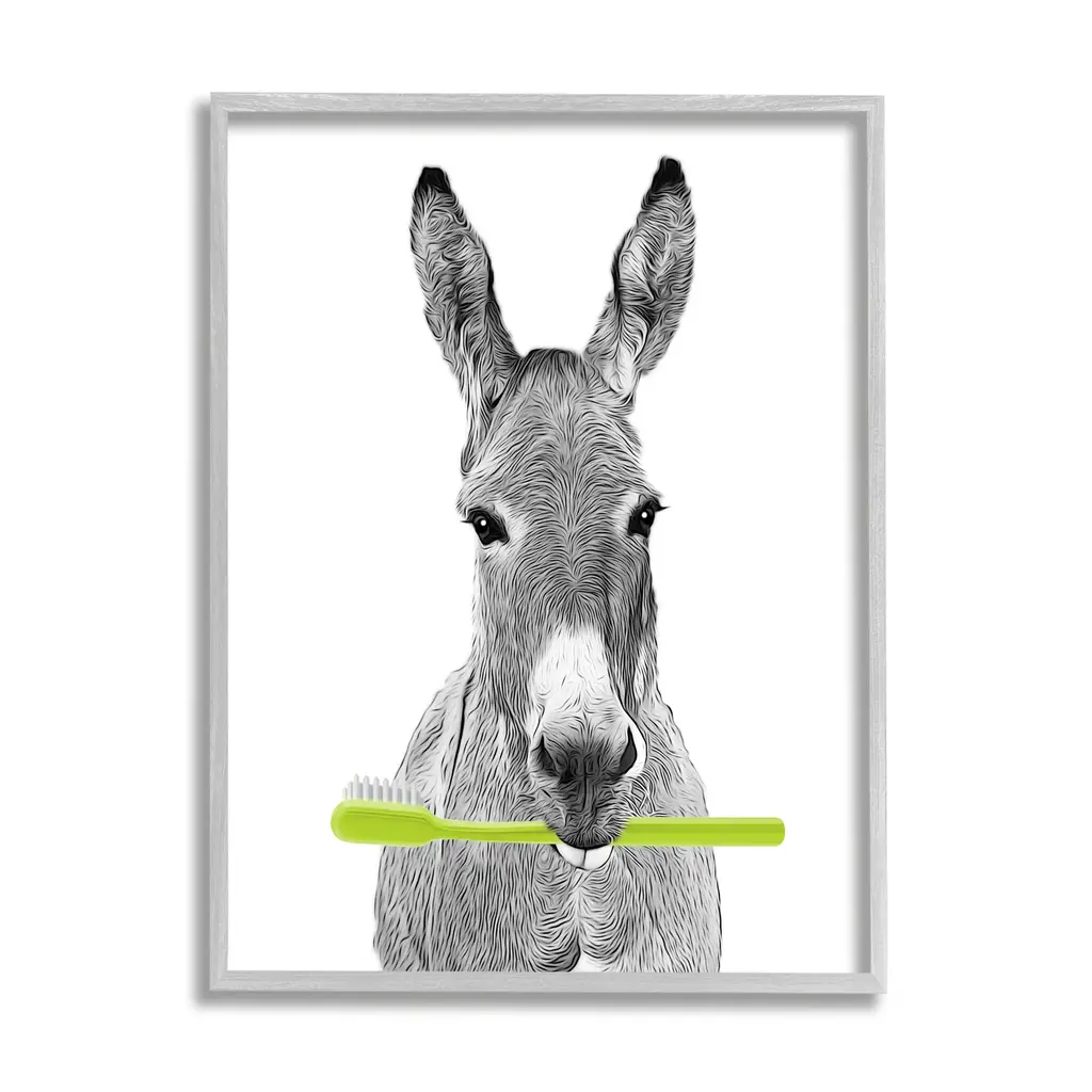 Add dimension to any room with our textured Framed Giclee Artwork. Our framed artwork is securely mounted into a 1.5-inch thick wood grain frame and ready to hang. Frames are available in three alluring styles: black, gray farmhouse and white. In addition, you should check out our oversized options if you want a statement piece. Stupell Wall Art is made in the USA.Features: Dimensions: 11 x 1.5 x 14 FramedFramed Giclee Sizes Include Standard: 11 x 1.5 x 14 Large: 16 x 1.5 x 20 Oversized: 24 x 1.5 x 30Wall Art is Ready to Hang - No Installation or Hardware Needed. For Easy Set Up Lean or Layer Artwork on Shelf or Against Wall.Our giclée prints are carefully mounted on a durable MDF backing, and then perfectly finished in a 1.5 inch thick woodgrain frame. Mounted frame colors include black, gray farmhouse and white. Made In USA.Artwork Relates To: Animal, Mammal, Wildlife, Bathroom, DonkeyDesign by Annalisa Latella