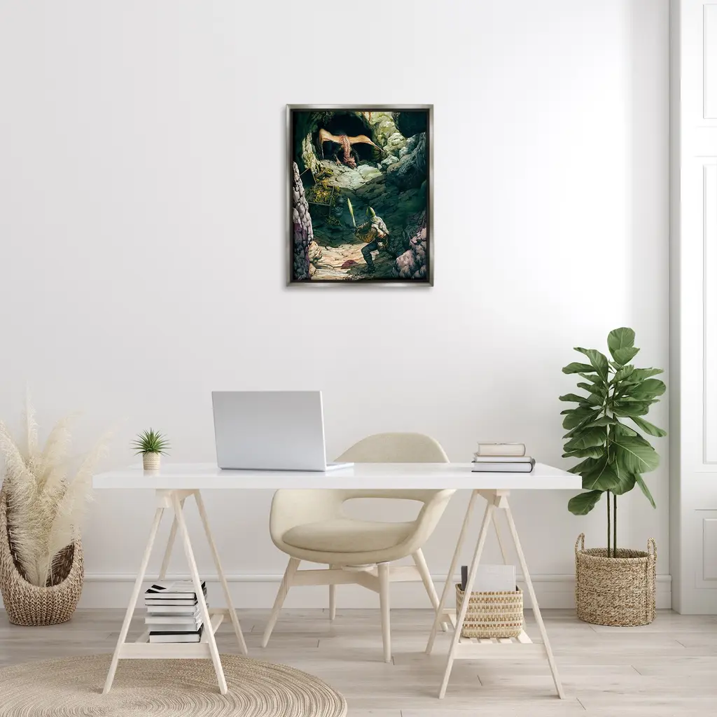 Elevate your home or office to the next level with Stupell Framed Floating Canvas Wall Art. Our premium hand-stretched canvas is mounted securely into a sturdy lightweight frame. The museum-style gap between the wrapped canvas and the box frame gives the illusion of floating artwork. Stupell Wall Art is made in the USA.Features: Dimensions: 17 x 1.7 x 21 Frame, 16 x 1.5 x 20 Canvas ArtFloating Frame Canvas Products are available in sizes 17"x21" and 25"x31". All Floating Frame Canvas Products have a 1.7" Depth.Wall Art is Ready to Hang with Hardware Free Hanging. No Installation required. For Easy Set Up Lean or Layer Artwork on Shelf or Against Wall. Artwork is Permently Fixed into the Frame.Our elevated 1.7" Thick Floating Frame is the perfect complement to our canvas style Wall Art. We use only the highest quality inks in house with industry leading printing solutions. Canvas is hand stretched over a durable wood foundation and then mounted securly into a Modern Box Frame. Made in the USA.Artwork Relates To: Dragon, Architecture, Animal, Reptile, Landscape, Surreal, Fantasy, Magical, Knight, Treasure, CaveDesign by Ciruelo