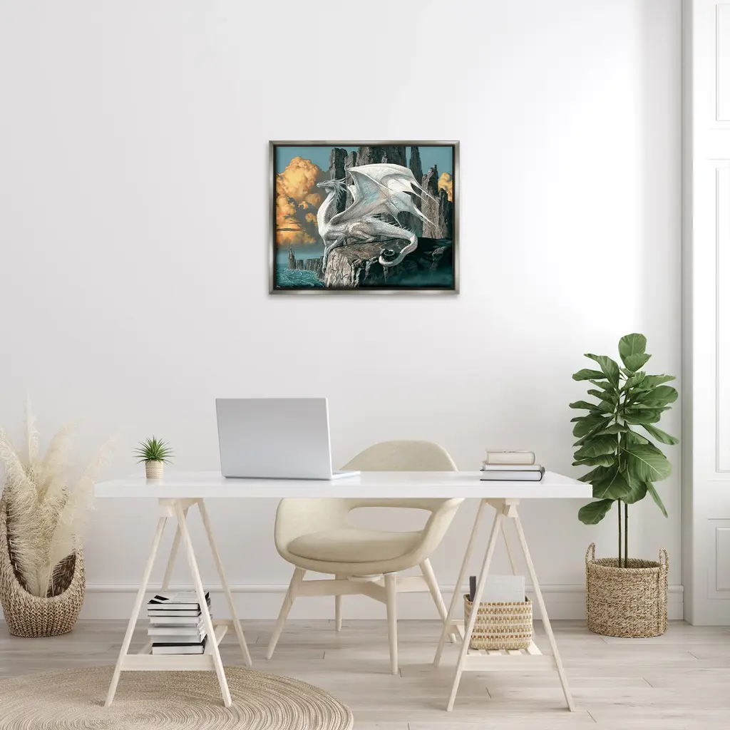 Elevate your home or office to the next level with Stupell Framed Floating Canvas Wall Art. Our premium hand-stretched canvas is mounted securely into a sturdy lightweight frame. The museum-style gap between the wrapped canvas and the box frame gives the illusion of floating artwork. Stupell Wall Art is made in the USA.Features: Dimensions: 21 x 1.7 x 17 Frame, 20 x 1.5 x 16 Canvas ArtFloating Frame Canvas Products are available in sizes 21"x17" and 31"x25". All Floating Frame Canvas Products have a 1.7" Depth.Wall Art is Ready to Hang with Hardware Free Hanging. No Installation required. For Easy Set Up Lean or Layer Artwork on Shelf or Against Wall. Artwork is Permently Fixed into the Frame.Our elevated 1.7" Thick Floating Frame is the perfect complement to our canvas style Wall Art. We use only the highest quality inks in house with industry leading printing solutions. Canvas is hand stretched over a durable wood foundation and then mounted securly into a Modern Box Frame. Made in the USA.Artwork Relates To: Dragon, Cliff, Rock, Ocean, Cloud, Animal, Reptile, Landscape, Surreal, Fantasy, MagicalDesign by Ciruelo