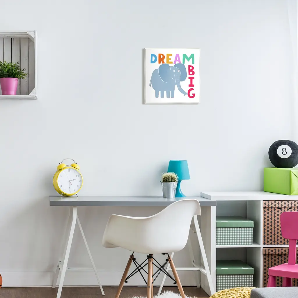 Our wall plaques start as high-quality lithograph prints mounted on durable 0.5-inch thick MDF wood. Each piece is hand finished and comes with a fresh layer of white foil on the sides to give it a crisp, clean look. Plaques arrive ready to hang without installation and come with removable plastic corners to keep them from damage in transit. Stupell Wall Art is made in the USA.Features: Dimensions: 12 x 0.5 x 12 InchesWall Art is Ready to Hang with Hardware Free Hanging. No installation required. For Easy Set Up Lean or Layer Artwork on Shelf or Against Wall.All of our wall plaques start off as high quality lithograph prints that are then mounted on durable 0.5 inch thick MDF wood. Each piece is hand finished and comes with a fresh layer of foil on the sides to give it a crisp clean look. Made In USA.Artwork Relates To: Animal, Elephant, Mammal, Wildlife, Dream BigDesign by Carla Daly