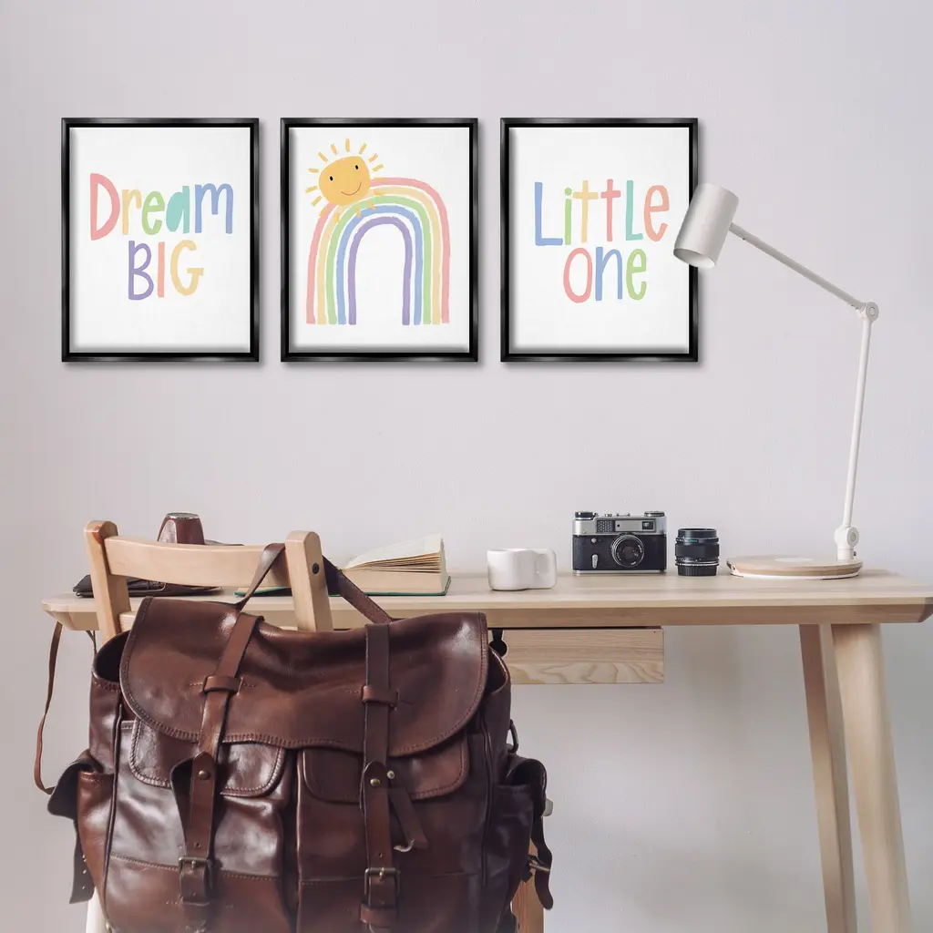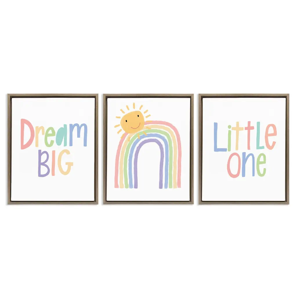 Elevate your home or office to the next level with Stupell Framed Floating Canvas Wall Art. Our premium hand-stretched canvas is mounted securely into a sturdy lightweight frame. The museum-style gap between the wrapped canvas and the box frame gives the illusion of floating artwork. Stupell Wall Art is made in the USA.Features: Dimensions: 3 Piece Set, Each Frame is 17 x 1.7 x 21Three Piece Floater Framed Canvas are available as 17x21 or 25x31 Panels. All Floater Frame Products have a 1.7" Depth.Wall Art is Ready to Hang with Hardware Free Hanging. No Installation required. For Easy Set Up Lean or Layer Artwork on Shelf or Against Wall. Artwork is Permently Fixed into the Frame.Our elevated 1.7" Thick Floating Frame is the perfect complement to our canvas style Wall Art. We use only the highest quality inks in house with industry leading printing solutions. Canvas is hand stretched over a durable wood foundation and then mounted securly into a Modern Box Frame. Made in the USA.Artwork Relates To: Phrase, Kids, Nature, Rainbow, Sun, Dream, NurseryDesign by Lisa Larson