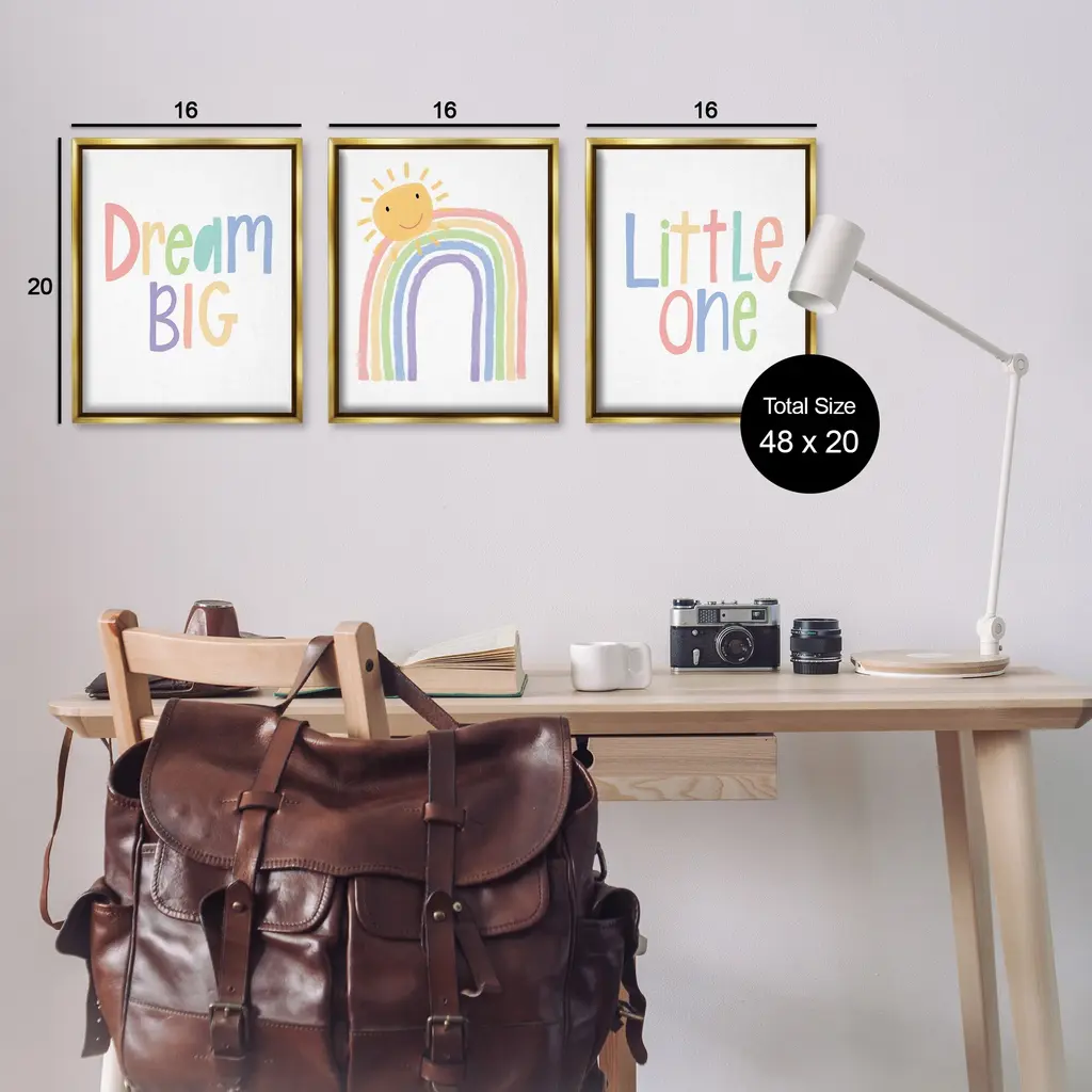 Elevate your home or office to the next level with Stupell Framed Floating Canvas Wall Art. Our premium hand-stretched canvas is mounted securely into a sturdy lightweight frame. The museum-style gap between the wrapped canvas and the box frame gives the illusion of floating artwork. Stupell Wall Art is made in the USA.Features: Dimensions: 3 Piece Set, Each Frame is 17 x 1.7 x 21Three Piece Floater Framed Canvas are available as 17x21 or 25x31 Panels. All Floater Frame Products have a 1.7" Depth.Wall Art is Ready to Hang with Hardware Free Hanging. No Installation required. For Easy Set Up Lean or Layer Artwork on Shelf or Against Wall. Artwork is Permently Fixed into the Frame.Our elevated 1.7" Thick Floating Frame is the perfect complement to our canvas style Wall Art. We use only the highest quality inks in house with industry leading printing solutions. Canvas is hand stretched over a durable wood foundation and then mounted securly into a Modern Box Frame. Made in the USA.Artwork Relates To: Phrase, Kids, Nature, Rainbow, Sun, Dream, NurseryDesign by Lisa Larson