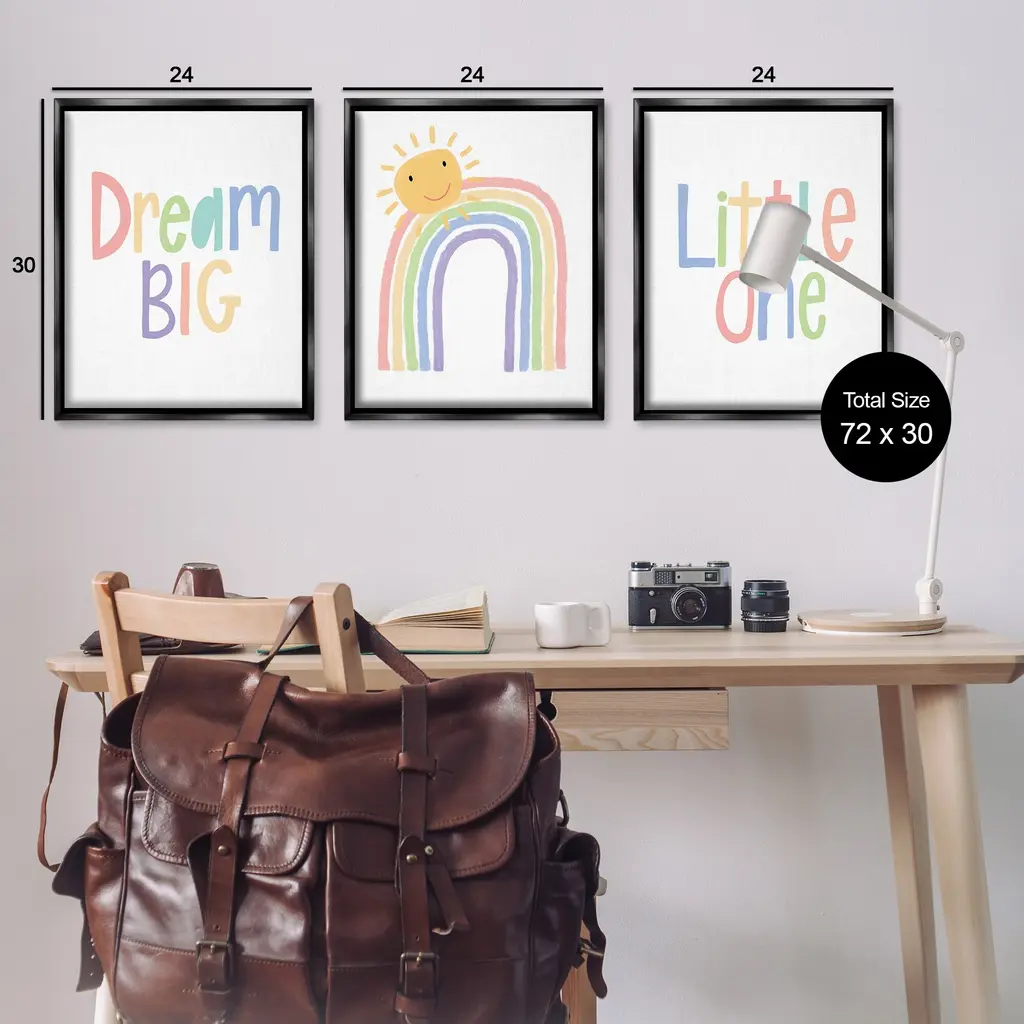 Elevate your home or office to the next level with Stupell Framed Floating Canvas Wall Art. Our premium hand-stretched canvas is mounted securely into a sturdy lightweight frame. The museum-style gap between the wrapped canvas and the box frame gives the illusion of floating artwork. Stupell Wall Art is made in the USA.Features: Dimensions: 3 Piece Set, Each Frame is 17 x 1.7 x 21Three Piece Floater Framed Canvas are available as 17x21 or 25x31 Panels. All Floater Frame Products have a 1.7" Depth.Wall Art is Ready to Hang with Hardware Free Hanging. No Installation required. For Easy Set Up Lean or Layer Artwork on Shelf or Against Wall. Artwork is Permently Fixed into the Frame.Our elevated 1.7" Thick Floating Frame is the perfect complement to our canvas style Wall Art. We use only the highest quality inks in house with industry leading printing solutions. Canvas is hand stretched over a durable wood foundation and then mounted securly into a Modern Box Frame. Made in the USA.Artwork Relates To: Phrase, Kids, Nature, Rainbow, Sun, Dream, NurseryDesign by Lisa Larson