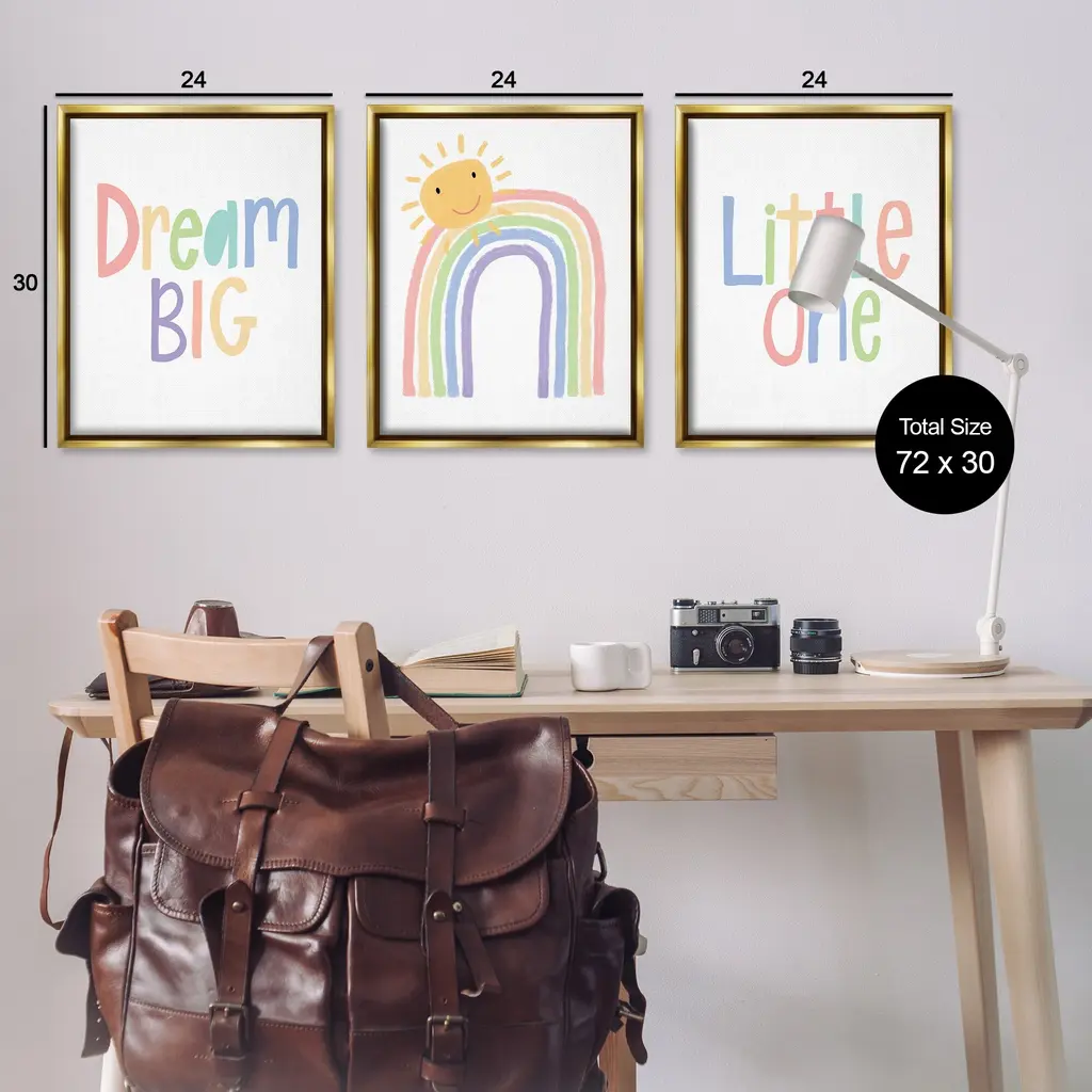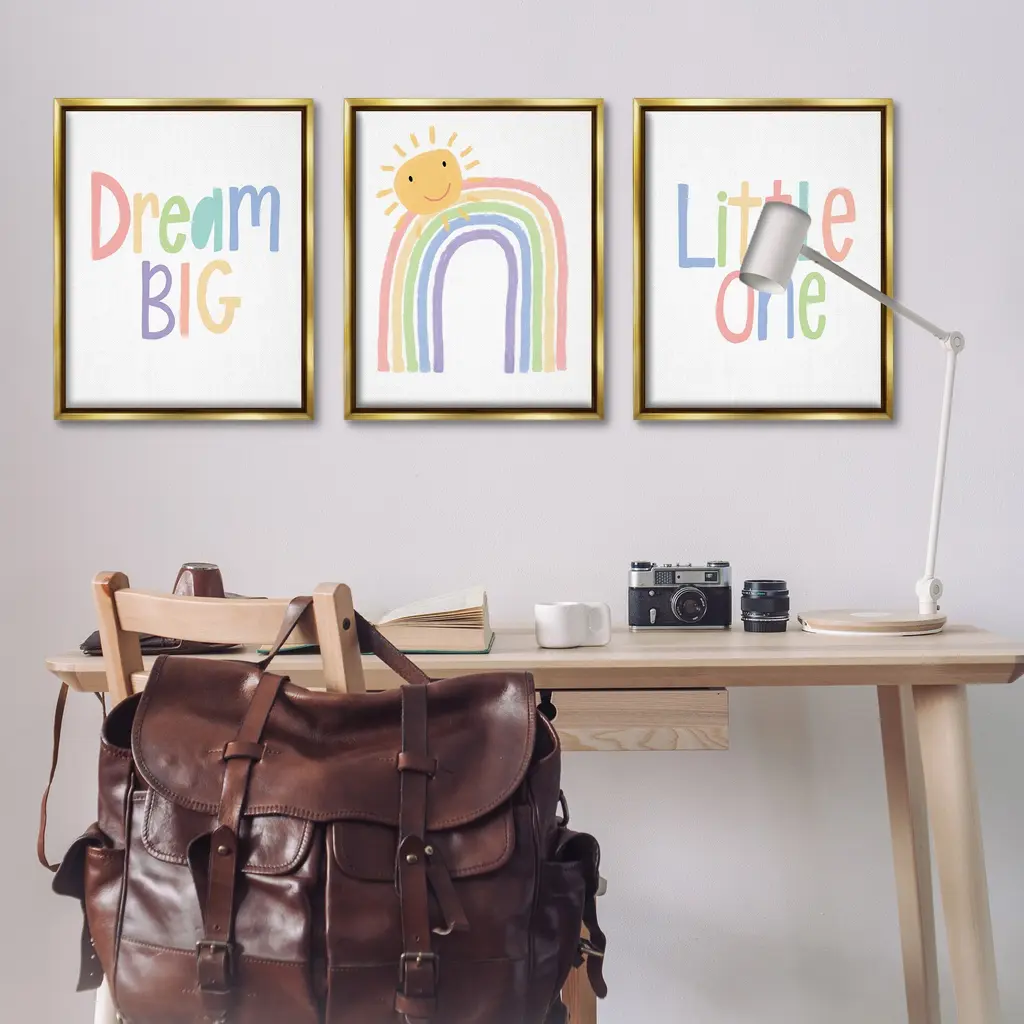 Elevate your home or office to the next level with Stupell Framed Floating Canvas Wall Art. Our premium hand-stretched canvas is mounted securely into a sturdy lightweight frame. The museum-style gap between the wrapped canvas and the box frame gives the illusion of floating artwork. Stupell Wall Art is made in the USA.Features: Dimensions: 3 Piece Set, Each Frame is 17 x 1.7 x 21Three Piece Floater Framed Canvas are available as 17x21 or 25x31 Panels. All Floater Frame Products have a 1.7" Depth.Wall Art is Ready to Hang with Hardware Free Hanging. No Installation required. For Easy Set Up Lean or Layer Artwork on Shelf or Against Wall. Artwork is Permently Fixed into the Frame.Our elevated 1.7" Thick Floating Frame is the perfect complement to our canvas style Wall Art. We use only the highest quality inks in house with industry leading printing solutions. Canvas is hand stretched over a durable wood foundation and then mounted securly into a Modern Box Frame. Made in the USA.Artwork Relates To: Phrase, Kids, Nature, Rainbow, Sun, Dream, NurseryDesign by Lisa Larson