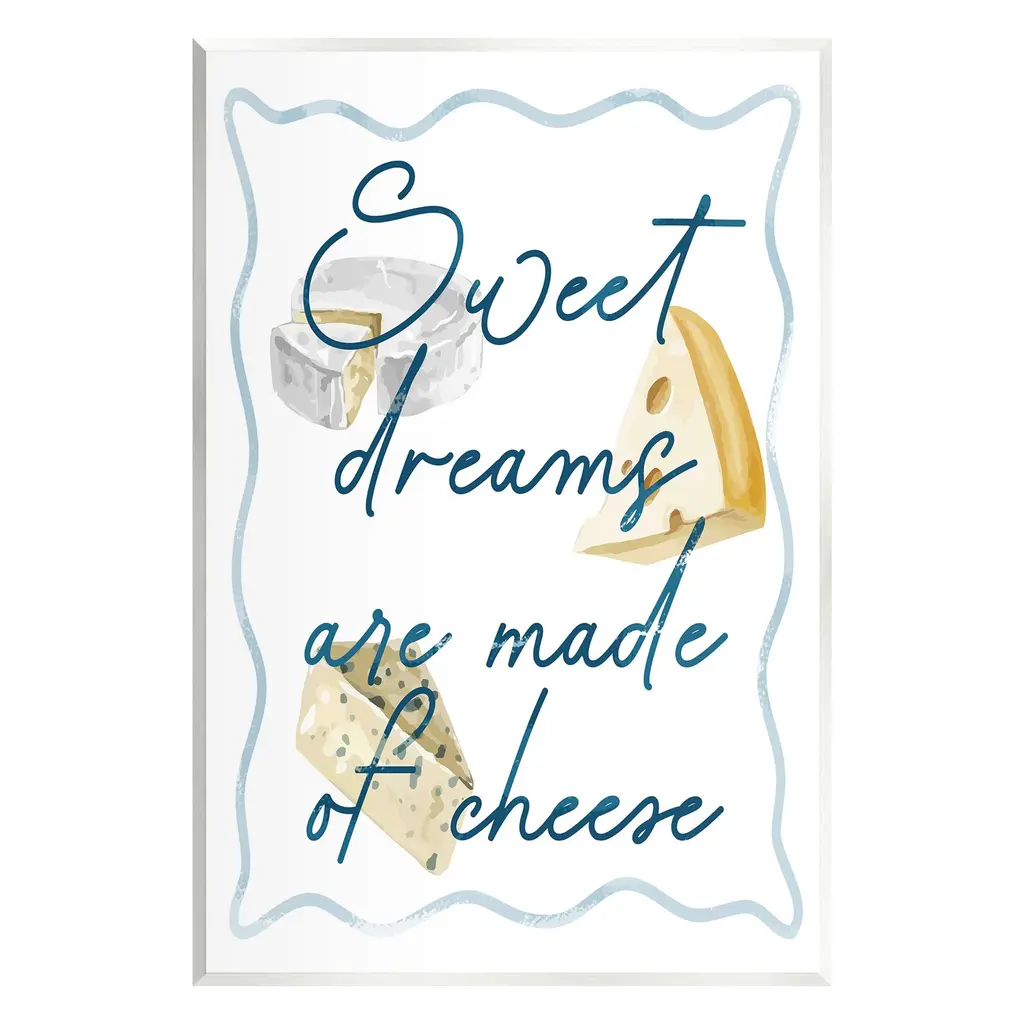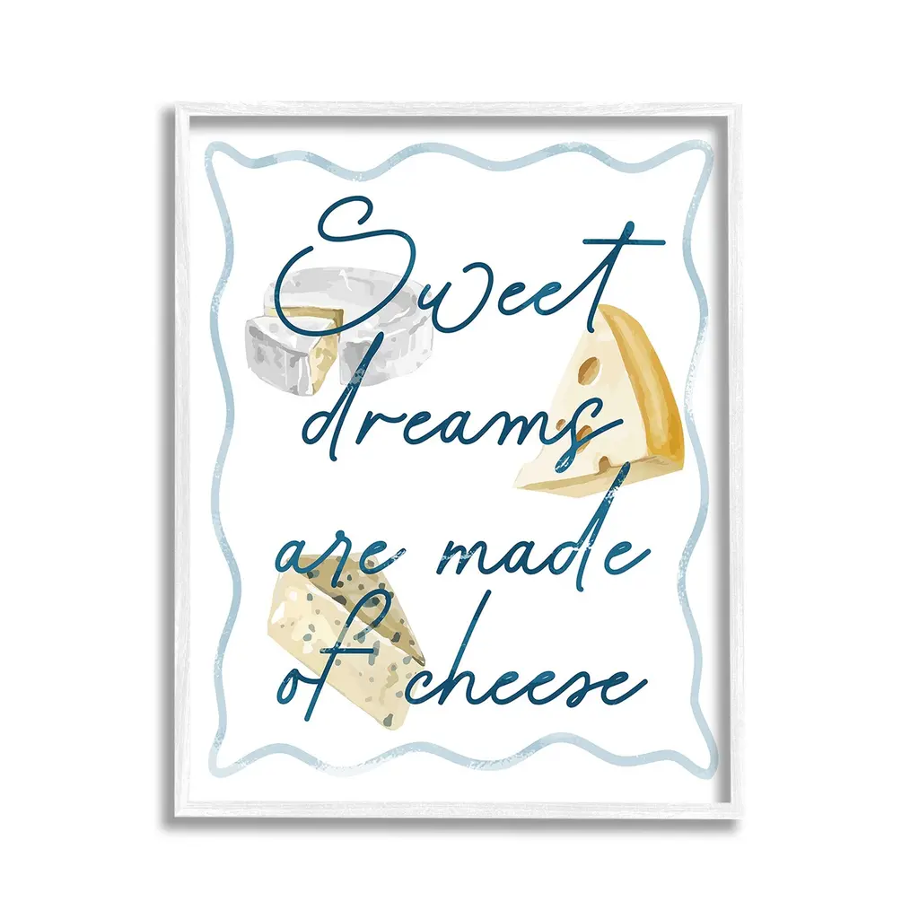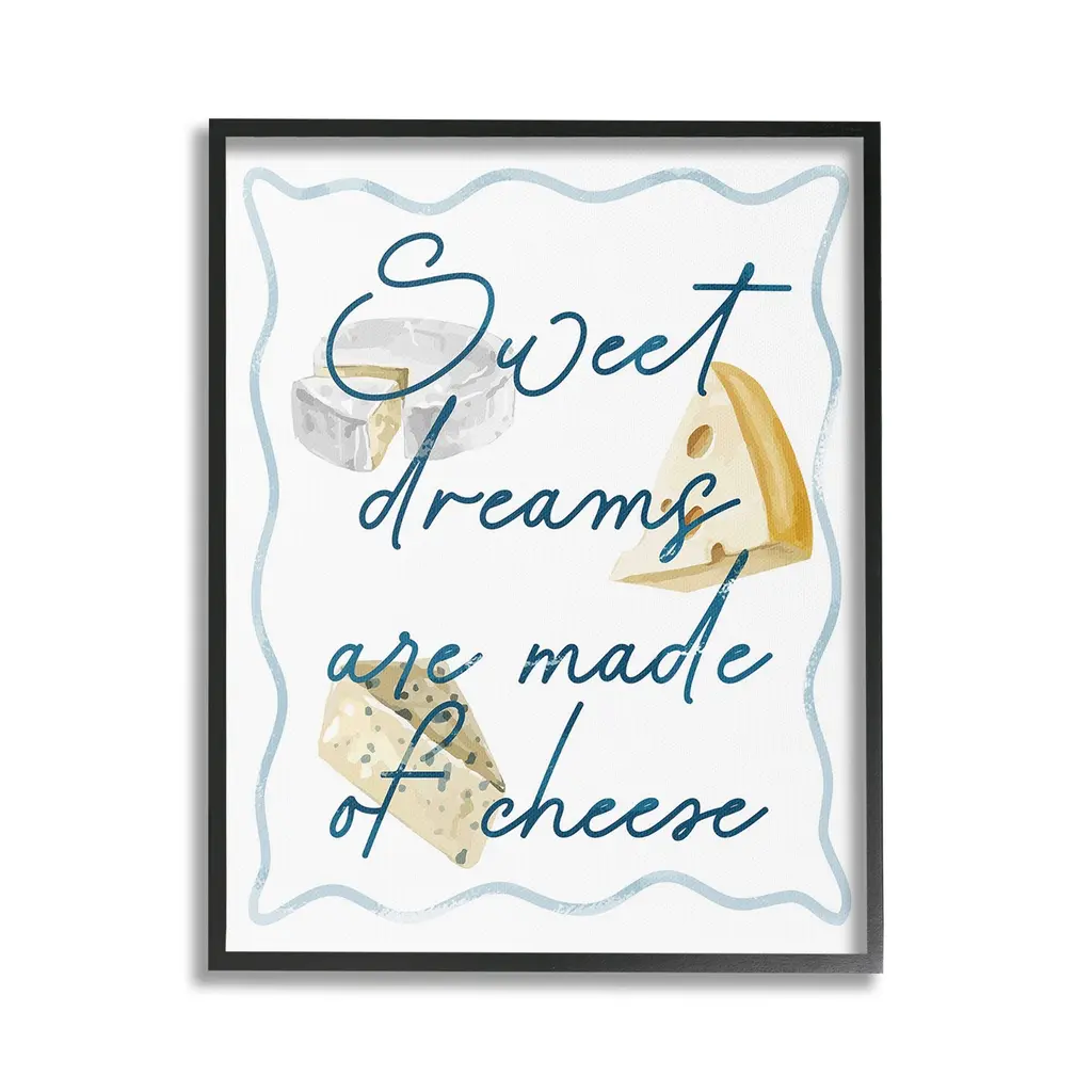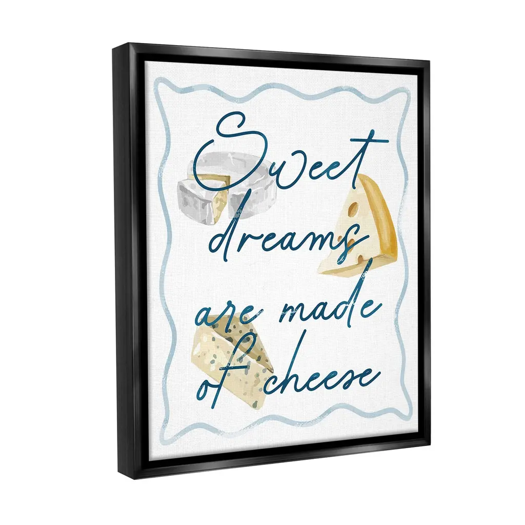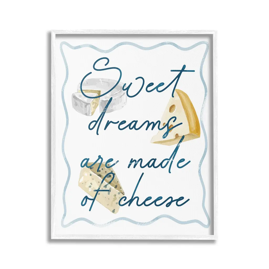 Elevate your home or office to the next level with Stupell Framed Floating Canvas Wall Art. Our premium hand-stretched canvas is mounted securely into a sturdy lightweight frame. The museum-style gap between the wrapped canvas and the box frame gives the illusion of floating artwork. Stupell Wall Art is made in the USA.Features: Dimensions: 17 x 1.7 x 21 Frame, 16 x 1.5 x 20 Canvas ArtFloating Frame Canvas Products are available in sizes 17"x21" and 25"x31". All Floating Frame Canvas Products have a 1.7" Depth.Wall Art is Ready to Hang with Hardware Free Hanging. No Installation required. For Easy Set Up Lean or Layer Artwork on Shelf or Against Wall. Artwork is Permently Fixed into the Frame.Our elevated 1.7" Thick Floating Frame is the perfect complement to our canvas style Wall Art. We use only the highest quality inks in house with industry leading printing solutions. Canvas is hand stretched over a durable wood foundation and then mounted securly into a Modern Box Frame. Made in the USA.Artwork Relates To: Food, Cheese, Humor, Funny, Kitchen, Sweet Dreams are Made of CheeseDesign by Lil' Rue