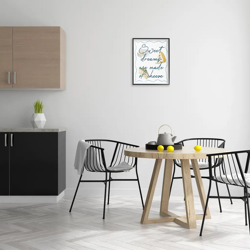 Add dimension to any room with our textured Framed Giclee Artwork. Our framed artwork is securely mounted into a 1.5-inch thick wood grain frame and ready to hang. Frames are available in three alluring styles: black, gray farmhouse and white. In addition, you should check out our oversized options if you want a statement piece. Stupell Wall Art is made in the USA.Features: Dimensions: 11 x 1.5 x 14 FramedFramed Giclee Products are available in the sizes 11"x14", 16"x20" or 24"x30". All Framed Giclee Products have a 1.5" Depth. Wall Art is Ready to Hang with Hardware Free Hanging. No installation required. For Easy Set Up Lean or Layer Artwork on Shelf or Against Wall.Our giclée prints are carefully mounted on a durable MDF backing, and then perfectly finished in a 1.5 inch thick woodgrain frame. Mounted frame colors include black, gray farmhouse and white. Made In USA.Artwork Relates To: Food, Cheese, Humor, Funny, Kitchen, Sweet Dreams are Made of CheeseDesign by Lil' Rue