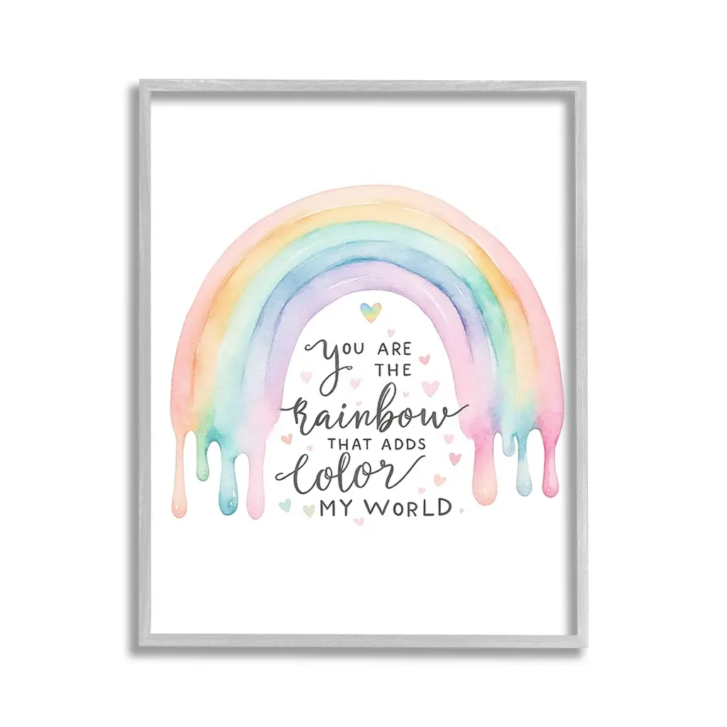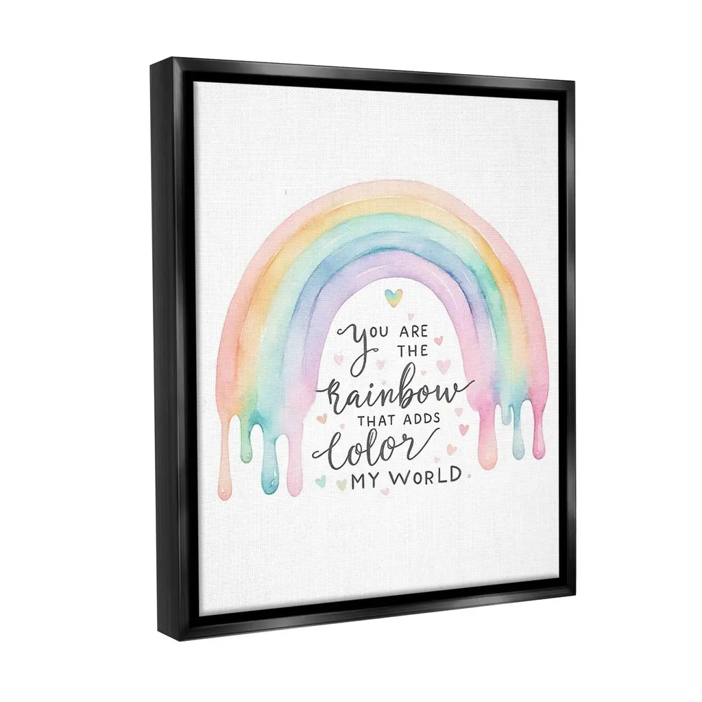 Elevate your home or office to the next level with Stupell Framed Floating Canvas Wall Art. Our premium hand-stretched canvas is mounted securely into a sturdy lightweight frame. The museum-style gap between the wrapped canvas and the box frame gives the illusion of floating artwork. Stupell Wall Art is made in the USA.Features: Dimensions: 17 x 1.7 x 21 Frame, 16 x 1.5 x 20 Canvas ArtFloating Frame Canvas Products are available in sizes 17"x21" and 25"x31". All Floating Frame Canvas Products have a 1.7" Depth.Wall Art is Ready to Hang with Hardware Free Hanging. No Installation required. For Easy Set Up Lean or Layer Artwork on Shelf or Against Wall. Artwork is Permently Fixed into the Frame.Our elevated 1.7" Thick Floating Frame is the perfect complement to our canvas style Wall Art. We use only the highest quality inks in house with industry leading printing solutions. Canvas is hand stretched over a durable wood foundation and then mounted securly into a Modern Box Frame. Made in the USA.Artwork Relates To: Landscape, Nature, Cloud, Rainbow, Pastel, Inspirational, Phrase, Heart, You are the Rainbow that Adds Color to my WorldDesign by Amanda Greenwood
