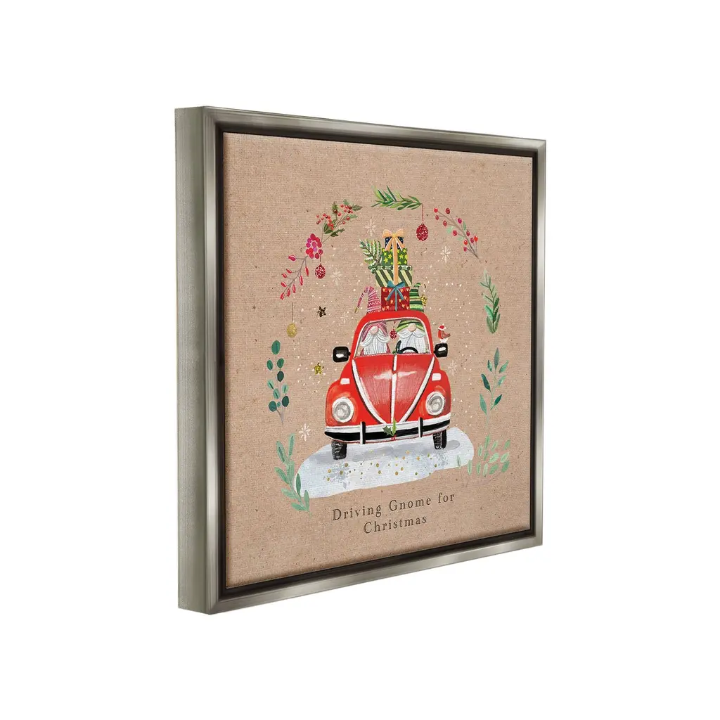 Elevate your home or office to the next level with Stupell Framed Floating Canvas Wall Art. Our premium hand-stretched canvas is mounted securely into a sturdy lightweight frame. The museum-style gap between the wrapped canvas and the box frame gives the illusion of floating artwork. Stupell Wall Art is made in the USA.Features: Dimensions: 18 x 1.7 x 18 Frame, 17 x 1.5 x 17 Canvas ArtFloating Frame Canvas Products are available in sizes 18"x18" and 25"x25". All Floating Frame Canvas Products have a 1.7" Depth.Wall Art is Ready to Hang with Hardware Free Hanging. No Installation required. For Easy Set Up Lean or Layer Artwork on Shelf or Against Wall. Artwork is Permently Fixed into the Frame.Our elevated 1.7" Thick Floating Frame is the perfect complement to our canvas style Wall Art. We use only the highest quality inks in house with industry leading printing solutions. Canvas is hand stretched over a durable wood foundation and then mounted securly into a Modern Box Frame. Made in the USA.Artwork Relates To: Floral, Plant, Winter, Snow, Scene, Holly Berry, Botanical, Holiday, Christmas, Gnome, Car, Truck, Ornament, Driving Gnome For ChristmasDesign by Sally Darby
