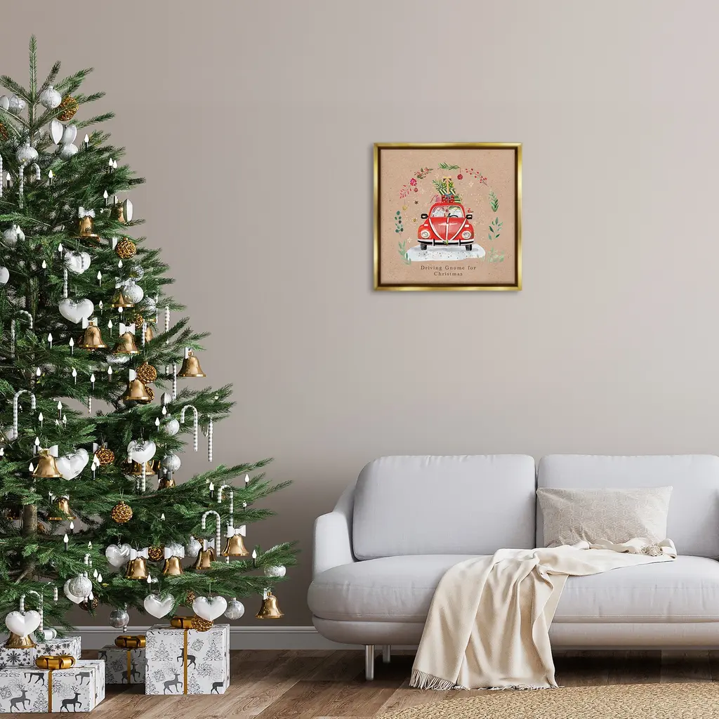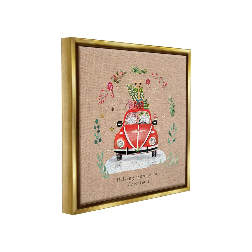 Elevate your home or office to the next level with Stupell Framed Floating Canvas Wall Art. Our premium hand-stretched canvas is mounted securely into a sturdy lightweight frame. The museum-style gap between the wrapped canvas and the box frame gives the illusion of floating artwork. Stupell Wall Art is made in the USA.Features: Dimensions: 18 x 1.7 x 18 Frame, 17 x 1.5 x 17 Canvas ArtFloating Frame Canvas Products are available in sizes 18"x18" and 25"x25". All Floating Frame Canvas Products have a 1.7" Depth.Wall Art is Ready to Hang with Hardware Free Hanging. No Installation required. For Easy Set Up Lean or Layer Artwork on Shelf or Against Wall. Artwork is Permently Fixed into the Frame.Our elevated 1.7" Thick Floating Frame is the perfect complement to our canvas style Wall Art. We use only the highest quality inks in house with industry leading printing solutions. Canvas is hand stretched over a durable wood foundation and then mounted securly into a Modern Box Frame. Made in the USA.Artwork Relates To: Floral, Plant, Winter, Snow, Scene, Holly Berry, Botanical, Holiday, Christmas, Gnome, Car, Truck, Ornament, Driving Gnome For ChristmasDesign by Sally Darby