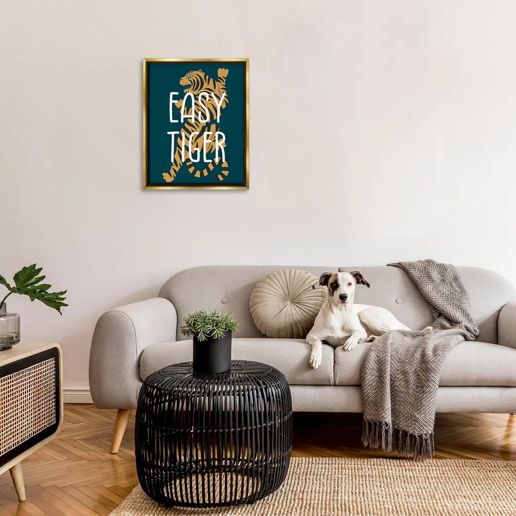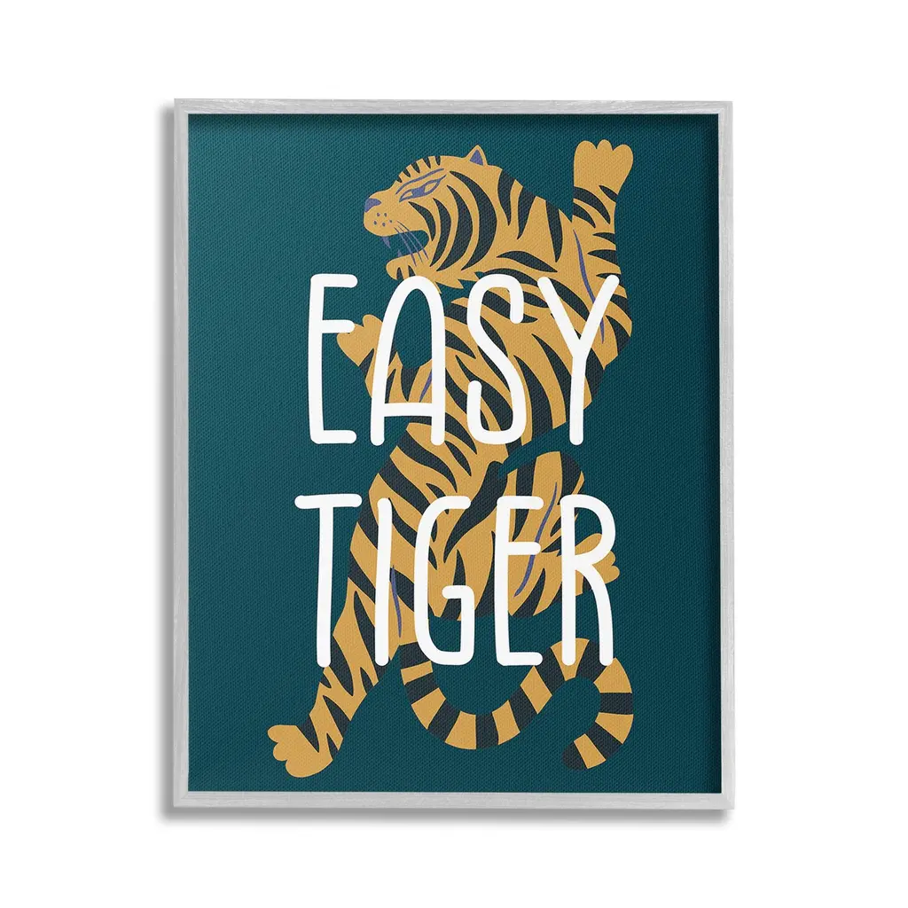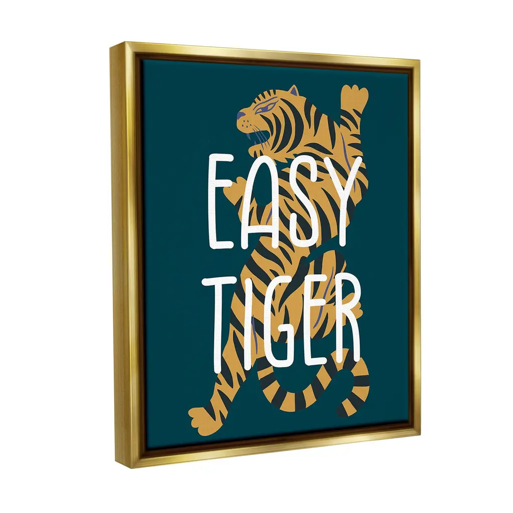 Elevate your home or office to the next level with Stupell Framed Floating Canvas Wall Art. Our premium hand-stretched canvas is mounted securely into a sturdy lightweight frame. The museum-style gap between the wrapped canvas and the box frame gives the illusion of floating artwork. Stupell Wall Art is made in the USA.Features: Dimensions: 17 x 1.7 x 21 Frame, 16 x 1.5 x 20 Canvas ArtFloating Frame Canvas Products are available in sizes 17"x21" and 25"x31". All Floating Frame Canvas Products have a 1.7" Depth.Wall Art is Ready to Hang with Hardware Free Hanging. No Installation required. For Easy Set Up Lean or Layer Artwork on Shelf or Against Wall. Artwork is Permently Fixed into the Frame.Our elevated 1.7" Thick Floating Frame is the perfect complement to our canvas style Wall Art. We use only the highest quality inks in house with industry leading printing solutions. Canvas is hand stretched over a durable wood foundation and then mounted securly into a Modern Box Frame. Made in the USA.Artwork Relates To: Animal, Wildlife, Mammal, Phrase, Jungle, Tiger, Easy TigerDesign by Lil' Rue