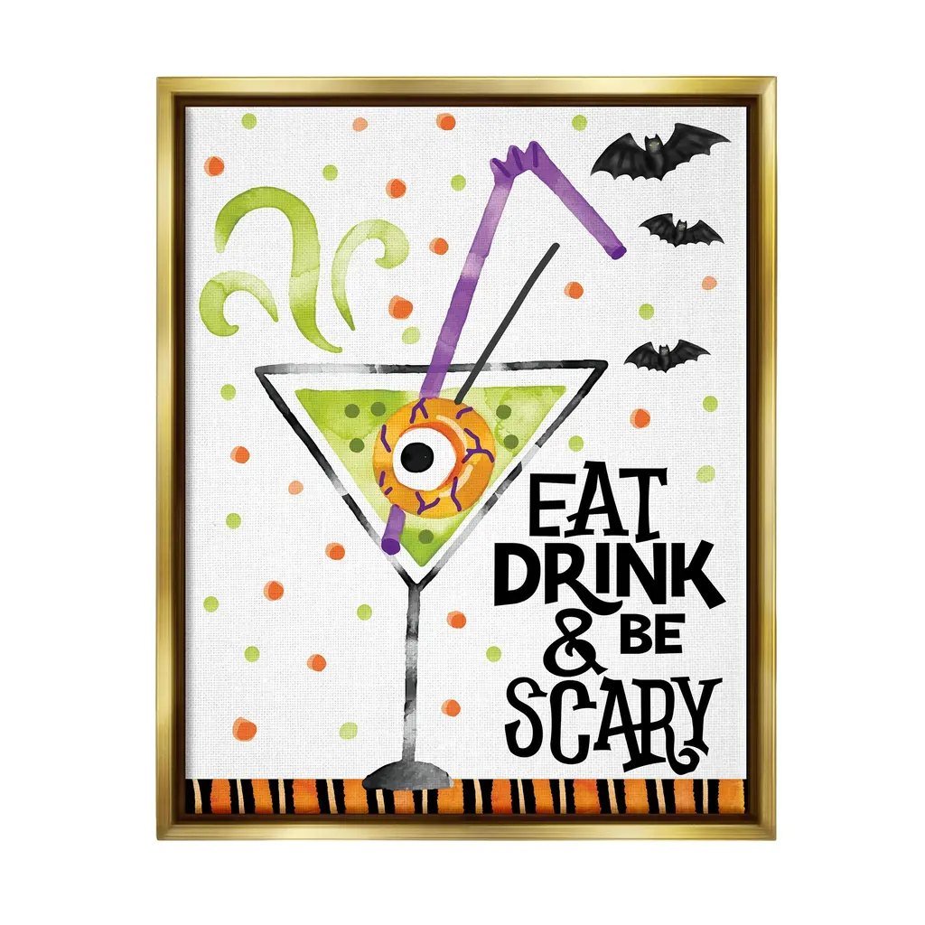 Elevate your home or office to the next level with Stupell Framed Floating Canvas Wall Art. Our premium hand-stretched canvas is mounted securely into a sturdy lightweight frame. The museum-style gap between the wrapped canvas and the box frame gives the illusion of floating artwork. Stupell Wall Art is made in the USA.Features: Dimensions: 17 x 1.7 x 21 Frame, 16 x 1.5 x 20 Canvas ArtFloating Frame Sizes Include Standard: 17 x 1.7 x 21 Oversized: 25 x 1.7 x 31Wall Art is Ready to Hang - No Installation or Hardware Needed. For Easy Set Up Lean or Layer Artwork on Shelf or Against Wall.Our elevated 1.7" Thick Floating Frame is the perfect complement to our canvas style Wall Art. We use only the highest quality inks in house with industry leading printing solutions. Canvas is hand stretched over a durable wood foundation and then mounted securly into a Modern Box Frame. Made in the USA.Artwork Relates To: Halloween, Candy, Eyeball, Spooky, Bats, Pattern, Stripes, Martini, Alcohol, Eat Drink & Be ScaryDesign by ND Art