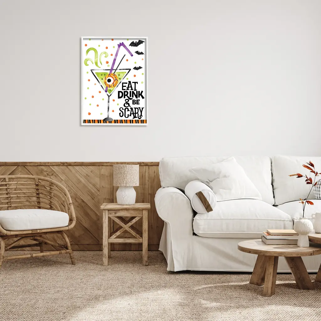 Add dimension to any room with our textured Framed Giclee Artwork. Our framed artwork is securely mounted into a 1.5-inch thick wood grain frame and ready to hang. Frames are available in three alluring styles: black, gray farmhouse and white. In addition, you should check out our oversized options if you want a statement piece. Stupell Wall Art is made in the USA.Features: Dimensions: 11 x 1.5 x 14 FramedFramed Giclee Sizes Include Standard: 11 x 1.5 x 14 Large: 16 x 1.5 x 20 Oversized: 24 x 1.5 x 30Wall Art is Ready to Hang - No Installation or Hardware Needed. For Easy Set Up Lean or Layer Artwork on Shelf or Against Wall.Our giclée prints are carefully mounted on a durable MDF backing, and then perfectly finished in a 1.5 inch thick woodgrain frame. Mounted frame colors include black, gray farmhouse and white. Made In USA.Artwork Relates To: Halloween, Candy, Eyeball, Spooky, Bats, Pattern, Stripes, Martini, Alcohol, Eat Drink & Be ScaryDesign by ND Art