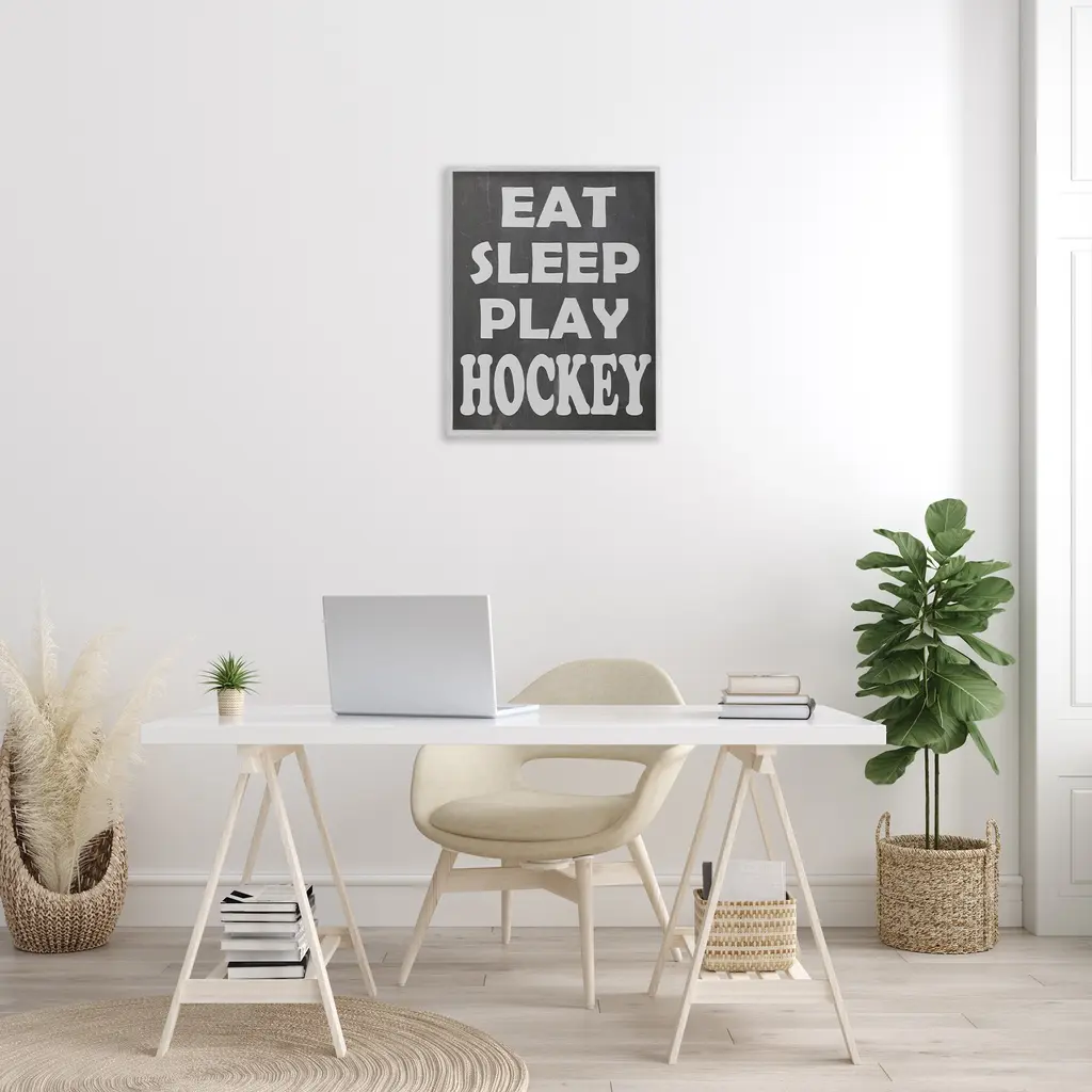 Add dimension to any room with our textured Framed Giclee Artwork. Our framed artwork is securely mounted into a 1.5-inch thick wood grain frame and ready to hang. Frames are available in three alluring styles: black, gray farmhouse and white. In addition, you should check out our oversized options if you want a statement piece. Stupell Wall Art is made in the USA.Features: Dimensions: 11 x 1.5 x 14 FramedFramed Giclee Products are available in the sizes 11"x14", 16"x20" or 24"x30". All Framed Giclee Products have a 1.5" Depth. Wall Art is Ready to Hang with Hardware Free Hanging. No installation required. For Easy Set Up Lean or Layer Artwork on Shelf or Against Wall.Our giclée prints are carefully mounted on a durable MDF backing, and then perfectly finished in a 1.5 inch thick woodgrain frame. Mounted frame colors include black, gray farmhouse and white. Made In USA.Artwork Relates To: Hockey, Sport, Ice Hockey, Vintage, Rustic, Eat Sleep Play HockeyDesign by Olivia Jean