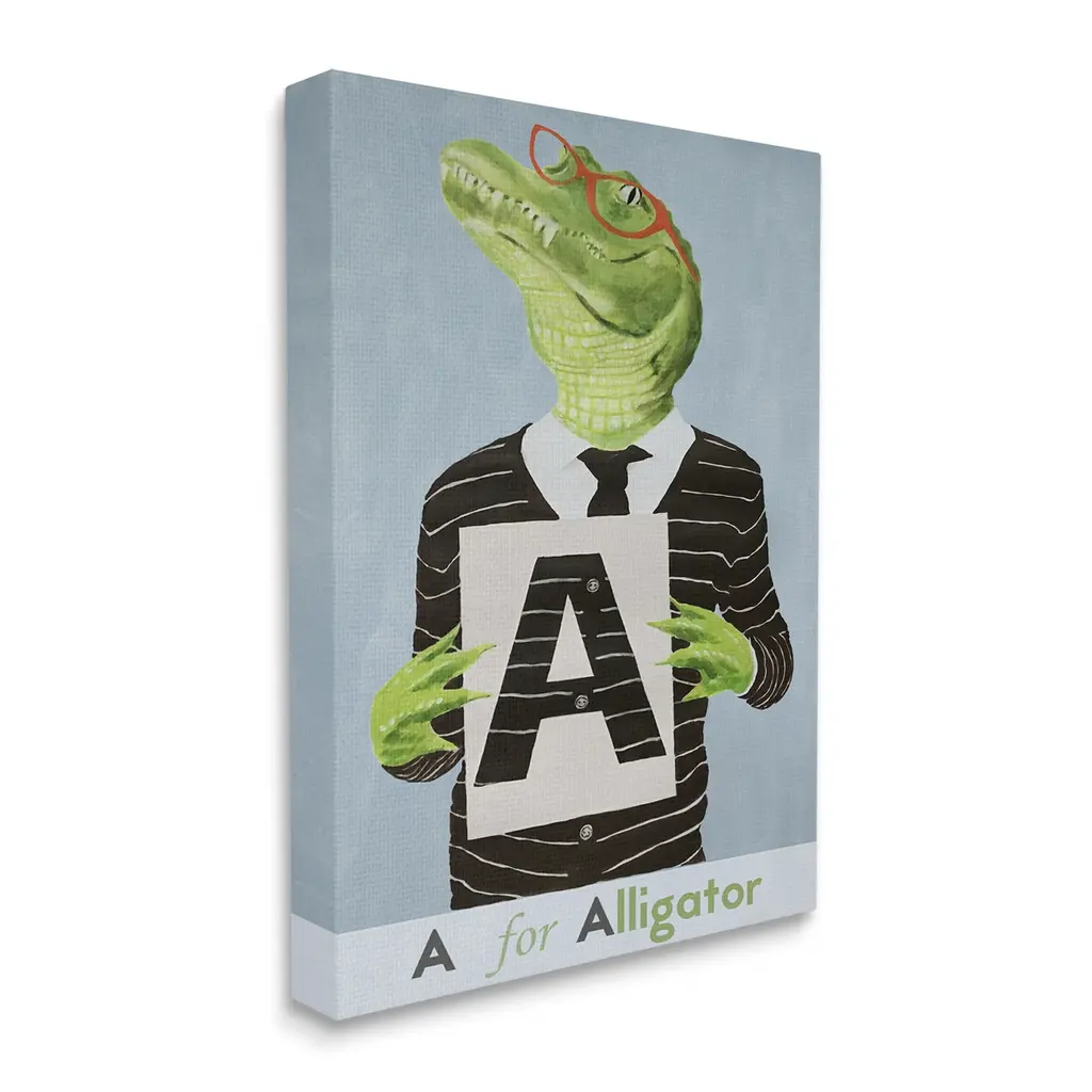 We create our stretched canvas to the highest standards. Using only the highest quality inks and canvas on Mimaki printers, we hand-cut and stretch each piece over a 1.5-inch thick wooden frame for hanging. As a result, the art comes ready to hang on the sturdy ledge with no installation required. Stupell Wall Art is made in the USA.Features: Dimensions: 16 x 1.5 x 20 InchesStretched Canvas Sizes Include Standard: 16 x 1.5 x 20 Large: 20 x 1.5 x 30 X-Large: 30 x 1.5 x 40 Oversized: 36 x 1.5 x 48Wall Art is Ready to Hang with Hardware Free Hanging. No installation required. For Easy Set Up Lean or Layer Artwork on Shelf or Against Wall.Our stretched canvas is created with the highest standards. We use only the highest quality inks and canvas on our in house Mimaki printers, and then hand cut and stretch each piece over a 1.5 inch thick wooden frame for hanging. Made In USA.Artwork Relates To: Animal, Reptile, Alligator, Educational, A for AlligatorDesign by Coco de Paris