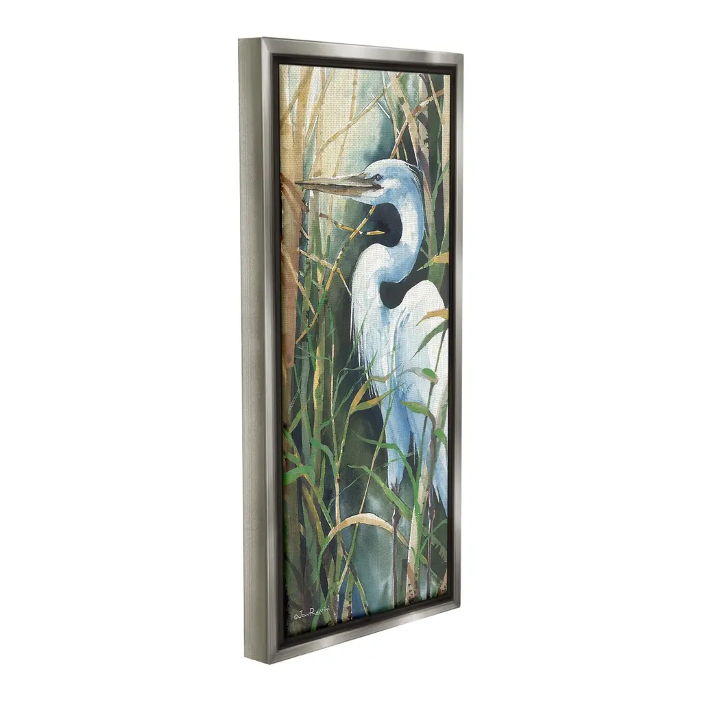 Elevate your home or office to the next level with Stupell Framed Floating Canvas Wall Art. Our premium hand-stretched canvas is mounted securely into a sturdy lightweight frame. The museum-style gap between the wrapped canvas and the box frame gives the illusion of floating artwork. Stupell Wall Art is made in the USA.Features: Dimensions: 11 x 1.7 x 25 Frame, 10 x 1.5 x 24 Canvas ArtFloating Frame Canvas Products are available in sizes 11"x25" and 14"x31". All Floating Frame Canvas Products have a 1.7" Depth.Wall Art is Ready to Hang with Hardware Free Hanging. No Installation required. For Easy Set Up Lean or Layer Artwork on Shelf or Against Wall. Artwork is Permently Fixed into the Frame.Our elevated 1.7" Thick Floating Frame is the perfect complement to our canvas style Wall Art. We use only the highest quality inks in house with industry leading printing solutions. Canvas is hand stretched over a durable wood foundation and then mounted securly into a Modern Box Frame. Made in the USA.Artwork Relates To: Animal, Bird, Waterfowl, Crane Bird, Land, Nature, Plant, Water, Heron, TraditionalDesign by John Rossini