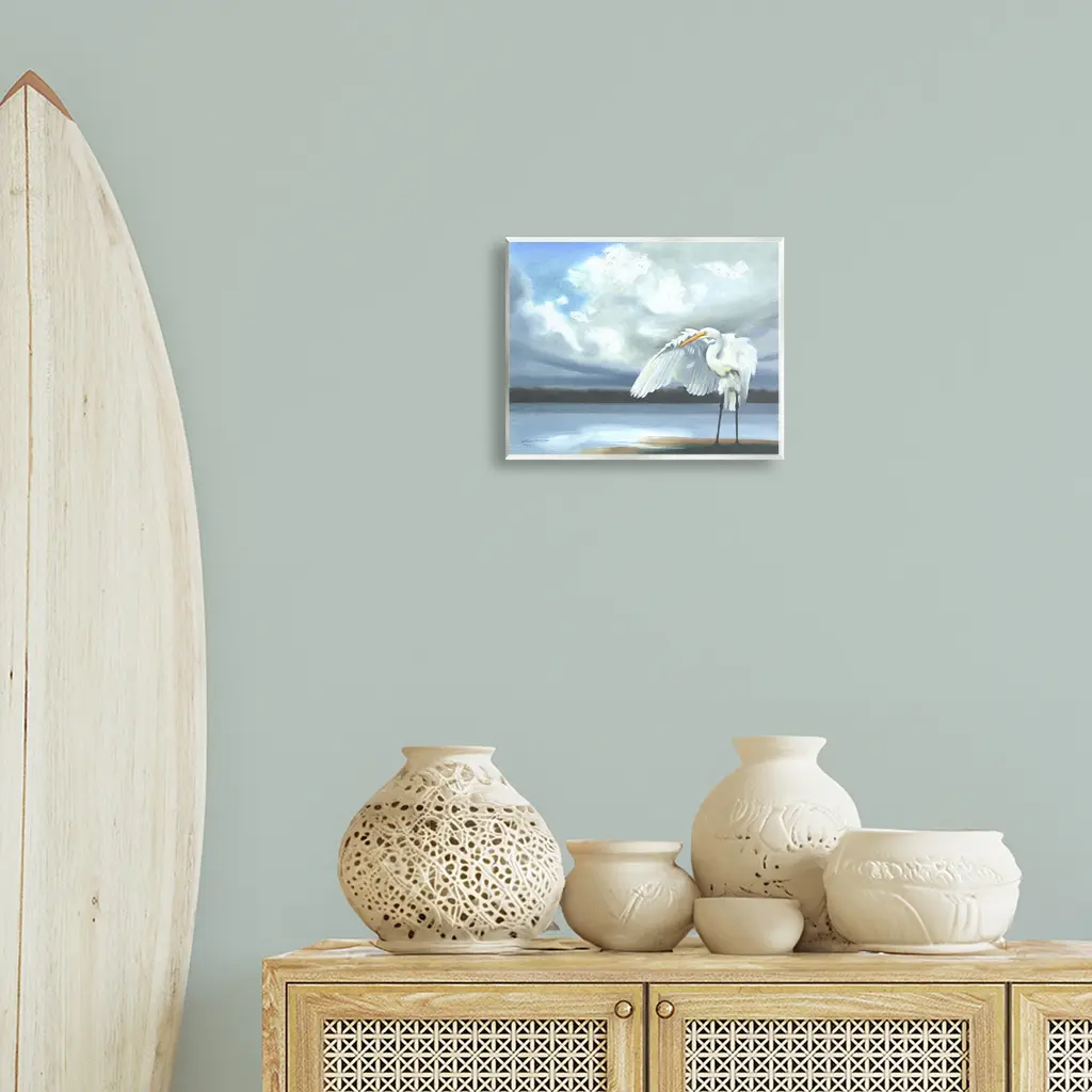 Stupell Egret On Cloudy Beach Shore Wall Plaque Art Design By D. Rust - 14 X 11