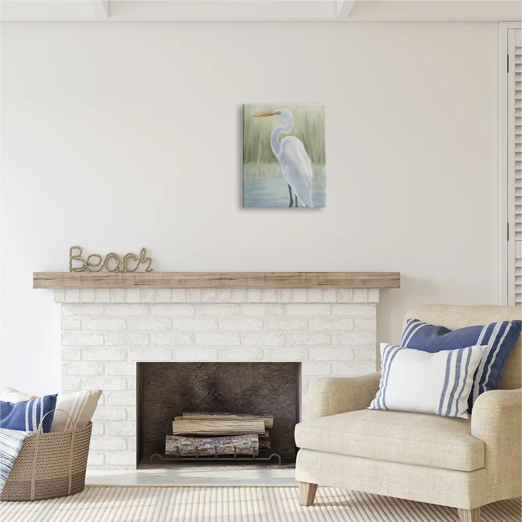 We create our stretched canvas to the highest standards. Using only the highest quality inks and canvas on Mimaki printers, we hand-cut and stretch each piece over a 1.5-inch thick wooden frame for hanging. As a result, the art comes ready to hang on the sturdy ledge with no installation required. Stupell Wall Art is made in the USA.Features: Dimensions: 16 x 1.5 x 20 InchesStretched Canvas Sizes Include Standard: 16 x 1.5 x 20 Large: 20 x 1.5 x 30 X-Large: 30 x 1.5 x 40 Oversized: 36 x 1.5 x 48Wall Art is Ready to Hang with Hardware Free Hanging. No installation required. For Easy Set Up Lean or Layer Artwork on Shelf or Against Wall.Our stretched canvas is created with the highest standards. We use only the highest quality inks and canvas on our in house Mimaki printers, and then hand cut and stretch each piece over a 1.5 inch thick wooden frame for hanging. Made In USA.Artwork Relates To: Animal, Bird, Waterfowl, Heron, Beach, Coast, Shore, Portrait, EgretDesign by Grace Popp