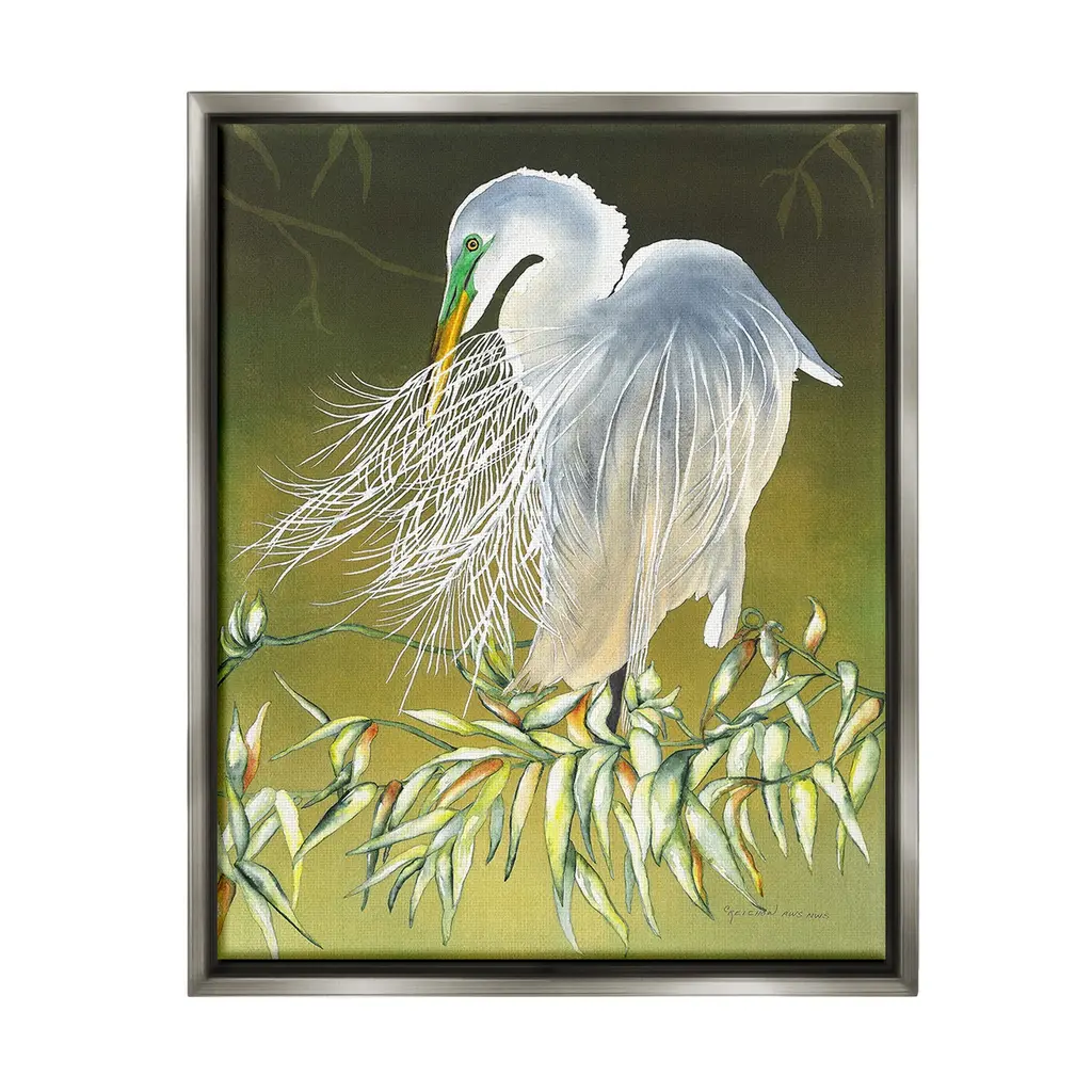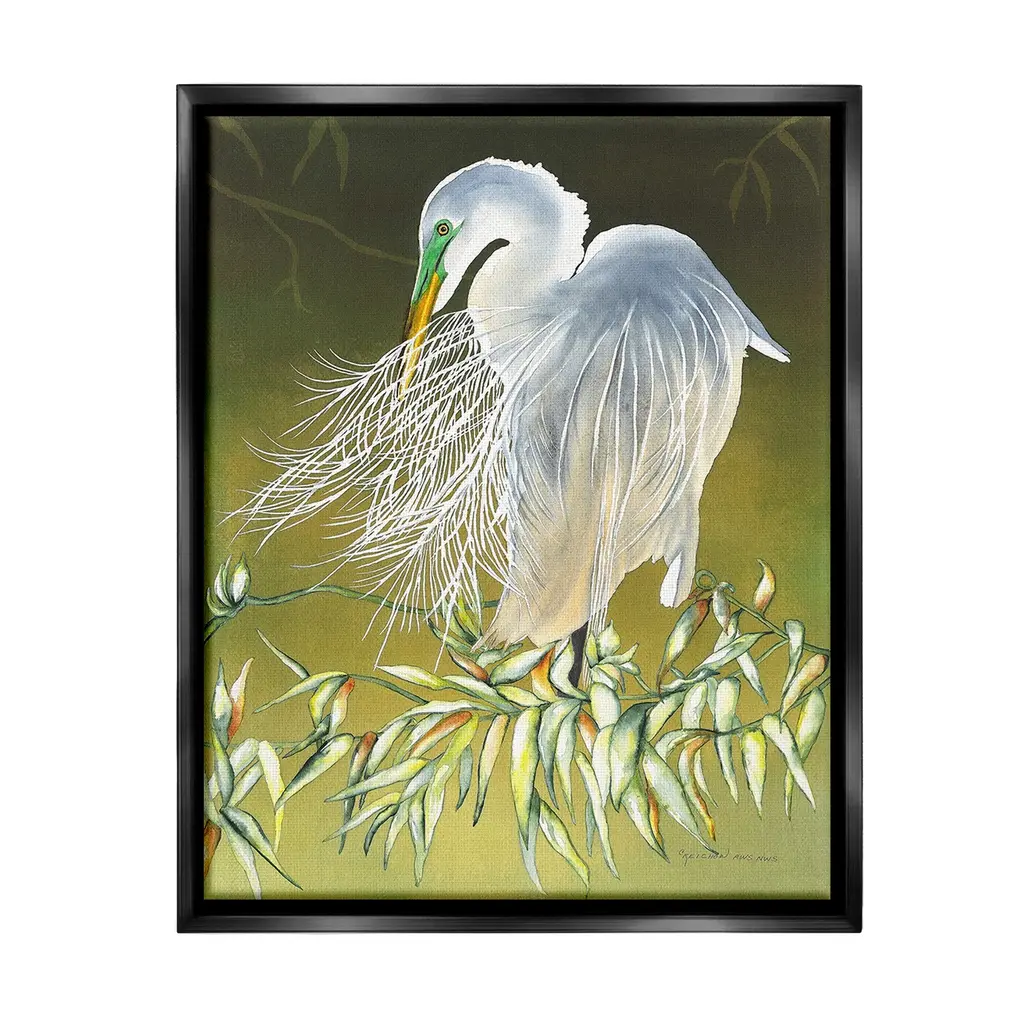 Elevate your home or office to the next level with Stupell Framed Floating Canvas Wall Art. Our premium hand-stretched canvas is mounted securely into a sturdy lightweight frame. The museum-style gap between the wrapped canvas and the box frame gives the illusion of floating artwork. Stupell Wall Art is made in the USA.Features: Dimensions: 17 x 1.7 x 21 Frame, 16 x 1.5 x 20 Canvas ArtFloating Frame Canvas Products are available in sizes 17"x21" and 25"x31". All Floating Frame Canvas Products have a 1.7" Depth.Wall Art is Ready to Hang with Hardware Free Hanging. No Installation required. For Easy Set Up Lean or Layer Artwork on Shelf or Against Wall. Artwork is Permently Fixed into the Frame.Our elevated 1.7" Thick Floating Frame is the perfect complement to our canvas style Wall Art. We use only the highest quality inks in house with industry leading printing solutions. Canvas is hand stretched over a durable wood foundation and then mounted securly into a Modern Box Frame. Made in the USA.Artwork Relates To: Animal, Bird, Waterfowl, Crane Bird, Heron, Egret, Nature, Branch, Leaf, TreeDesign by Christine Reichow
