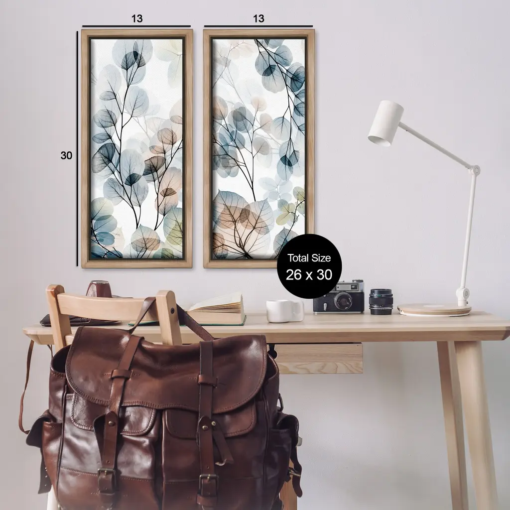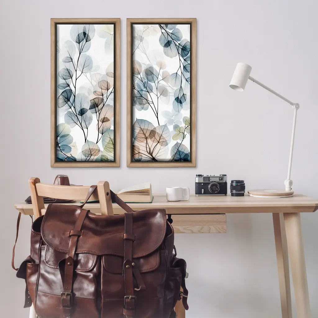 Elevate your home or office to the next level with Stupell Framed Floating Canvas Wall Art. Our premium hand-stretched canvas is mounted securely into a sturdy lightweight frame. The museum-style gap between the wrapped canvas and the box frame gives the illusion of floating artwork. Stupell Wall Art is made in the USA.Features: Dimensions: 2 Piece Set, Each Frame is 11 x 1.7 x 25Two Piece Floating Frame Canvas Products are available as 11"x25" or 14"x31" Panels. All Floating Frame Canvas Products have a 1.7" Depth.Wall Art is Ready to Hang with Hardware Free Hanging. No Installation required. For Easy Set Up Lean or Layer Artwork on Shelf or Against Wall. Artwork is Permently Fixed into the Frame.Our elevated 1.7" Thick Floating Frame is the perfect complement to our canvas style Wall Art. We use only the highest quality inks in house with industry leading printing solutions. Canvas is hand stretched over a durable wood foundation and then mounted securly into a Modern Box Frame. Made in the USA.Artwork Relates To: Floral, Pattern, Modern, Pattern, Abstract, Leaf, EucalyptusDesign by Albert Koetsier