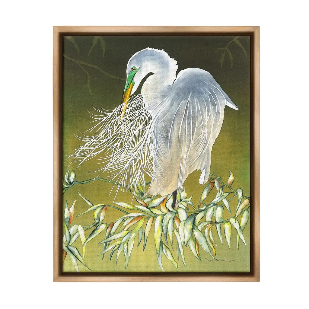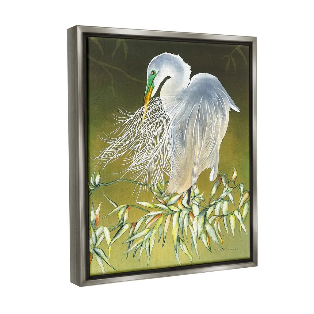 Elevate your home or office to the next level with Stupell Framed Floating Canvas Wall Art. Our premium hand-stretched canvas is mounted securely into a sturdy lightweight frame. The museum-style gap between the wrapped canvas and the box frame gives the illusion of floating artwork. Stupell Wall Art is made in the USA.Features: Dimensions: 17 x 1.7 x 21 Frame, 16 x 1.5 x 20 Canvas ArtFloating Frame Canvas Products are available in sizes 17"x21" and 25"x31". All Floating Frame Canvas Products have a 1.7" Depth.Wall Art is Ready to Hang with Hardware Free Hanging. No Installation required. For Easy Set Up Lean or Layer Artwork on Shelf or Against Wall. Artwork is Permently Fixed into the Frame.Our elevated 1.7" Thick Floating Frame is the perfect complement to our canvas style Wall Art. We use only the highest quality inks in house with industry leading printing solutions. Canvas is hand stretched over a durable wood foundation and then mounted securly into a Modern Box Frame. Made in the USA.Artwork Relates To: Animal, Bird, Waterfowl, Egret, Heron, Leaf, Plant, Botanical, TraditionalDesign by Christine Reichow