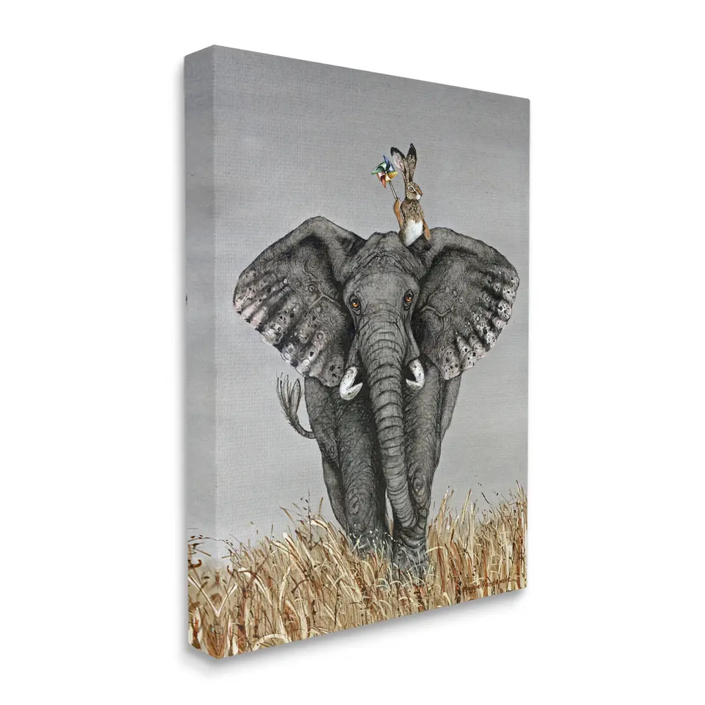 We create our stretched canvas to the highest standards. Using only the highest quality inks and canvas on Mimaki printers, we hand-cut and stretch each piece over a 1.5-inch thick wooden frame for hanging. As a result, the art comes ready to hang on the sturdy ledge with no installation required. Stupell Wall Art is made in the USA.Features: Dimensions: 16 x 1.5 x 20 InchesStretched Canvas Sizes Include Standard: 16 x 1.5 x 20 Large: 20 x 1.5 x 30 X-Large: 30 x 1.5 x 40 Oversized: 36 x 1.5 x 48Wall Art is Ready to Hang with Hardware Free Hanging. No installation required. For Easy Set Up Lean or Layer Artwork on Shelf or Against Wall.Our stretched canvas is created with the highest standards. We use only the highest quality inks and canvas on our in house Mimaki printers, and then hand cut and stretch each piece over a 1.5 inch thick wooden frame for hanging. Made In USA.Artwork Relates To: Animal, Elephant, Mammal, Wildlife, Pinwheel, Rabbit, Landscape, BunnyDesign by Maggie Vandewalle
