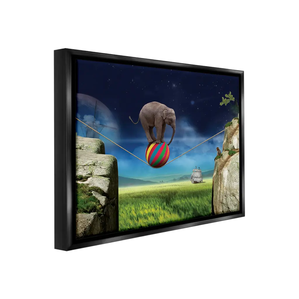 Elevate your home or office to the next level with Stupell Framed Floating Canvas Wall Art. Our premium hand-stretched canvas is mounted securely into a sturdy lightweight frame. The museum-style gap between the wrapped canvas and the box frame gives the illusion of floating artwork. Stupell Wall Art is made in the USA.Features: Dimensions: 21 x 1.7 x 17 Frame, 20 x 1.5 x 16 Canvas ArtFloating Frame Canvas Products are available in sizes 21"x17" and 31"x25". All Floating Frame Canvas Products have a 1.7" Depth.Wall Art is Ready to Hang with Hardware Free Hanging. No Installation required. For Easy Set Up Lean or Layer Artwork on Shelf or Against Wall. Artwork is Permently Fixed into the Frame.Our elevated 1.7" Thick Floating Frame is the perfect complement to our canvas style Wall Art. We use only the highest quality inks in house with industry leading printing solutions. Canvas is hand stretched over a durable wood foundation and then mounted securly into a Modern Box Frame. Made in the USA.Artwork Relates To: Animal, Elephant, Mammal, Wildlife, Rock, Landscape, Nature, Scenery, Grass, Sky, Field, Rope, SurrealDesign by Noble Works