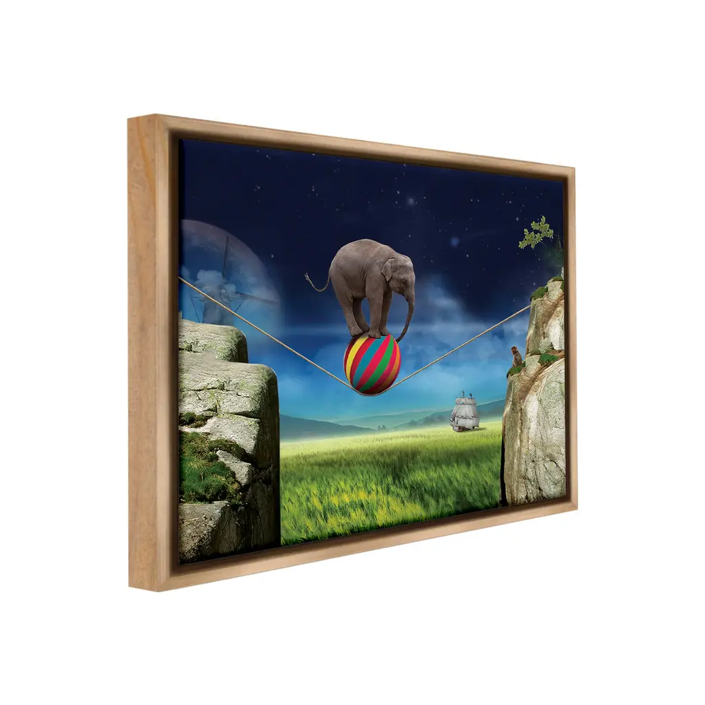 Elevate your home or office to the next level with Stupell Framed Floating Canvas Wall Art. Our premium hand-stretched canvas is mounted securely into a sturdy lightweight frame. The museum-style gap between the wrapped canvas and the box frame gives the illusion of floating artwork. Stupell Wall Art is made in the USA.Features: Dimensions: 21 x 1.7 x 17 Frame, 20 x 1.5 x 16 Canvas ArtFloating Frame Canvas Products are available in sizes 21"x17" and 31"x25". All Floating Frame Canvas Products have a 1.7" Depth.Wall Art is Ready to Hang with Hardware Free Hanging. No Installation required. For Easy Set Up Lean or Layer Artwork on Shelf or Against Wall. Artwork is Permently Fixed into the Frame.Our elevated 1.7" Thick Floating Frame is the perfect complement to our canvas style Wall Art. We use only the highest quality inks in house with industry leading printing solutions. Canvas is hand stretched over a durable wood foundation and then mounted securly into a Modern Box Frame. Made in the USA.Artwork Relates To: Animal, Elephant, Mammal, Wildlife, Rock, Landscape, Nature, Scenery, Grass, Sky, Field, Rope, SurrealDesign by Noble Works