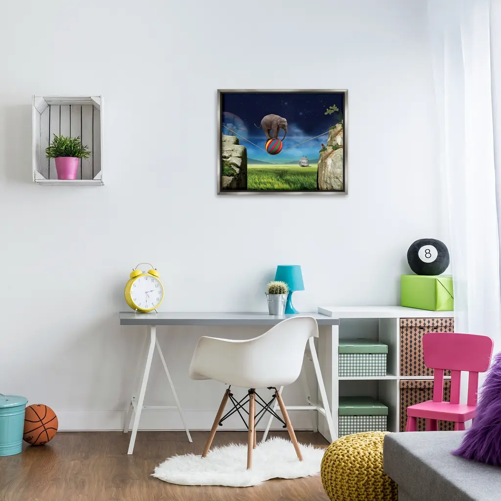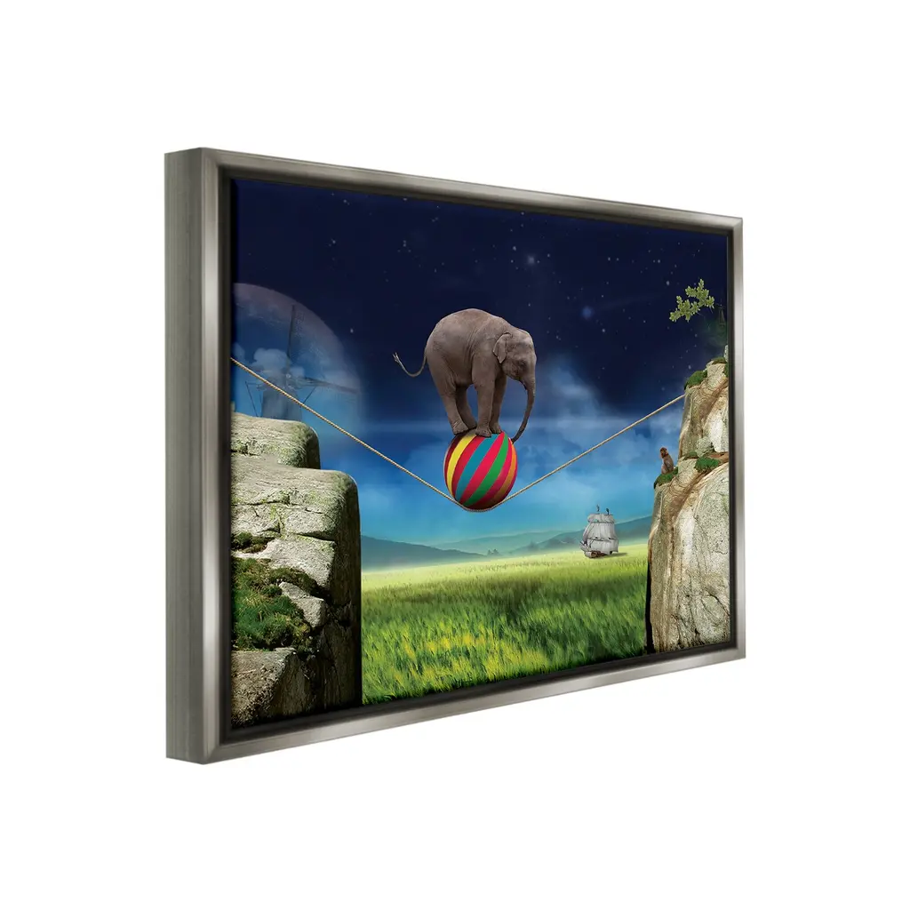 Elevate your home or office to the next level with Stupell Framed Floating Canvas Wall Art. Our premium hand-stretched canvas is mounted securely into a sturdy lightweight frame. The museum-style gap between the wrapped canvas and the box frame gives the illusion of floating artwork. Stupell Wall Art is made in the USA.Features: Dimensions: 21 x 1.7 x 17 Frame, 20 x 1.5 x 16 Canvas ArtFloating Frame Canvas Products are available in sizes 21"x17" and 31"x25". All Floating Frame Canvas Products have a 1.7" Depth.Wall Art is Ready to Hang with Hardware Free Hanging. No Installation required. For Easy Set Up Lean or Layer Artwork on Shelf or Against Wall. Artwork is Permently Fixed into the Frame.Our elevated 1.7" Thick Floating Frame is the perfect complement to our canvas style Wall Art. We use only the highest quality inks in house with industry leading printing solutions. Canvas is hand stretched over a durable wood foundation and then mounted securly into a Modern Box Frame. Made in the USA.Artwork Relates To: Animal, Elephant, Mammal, Wildlife, Rock, Landscape, Nature, Scenery, Grass, Sky, Field, Rope, SurrealDesign by Noble Works