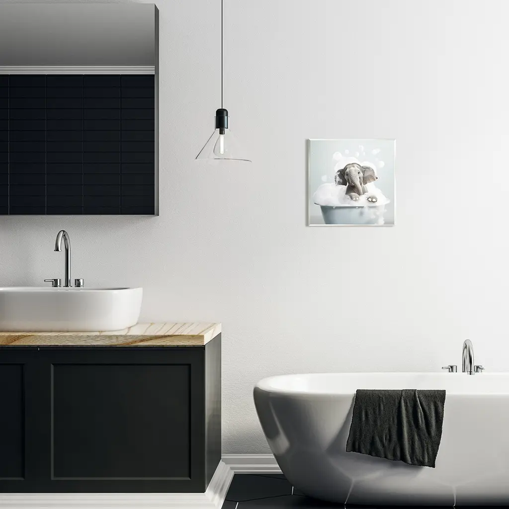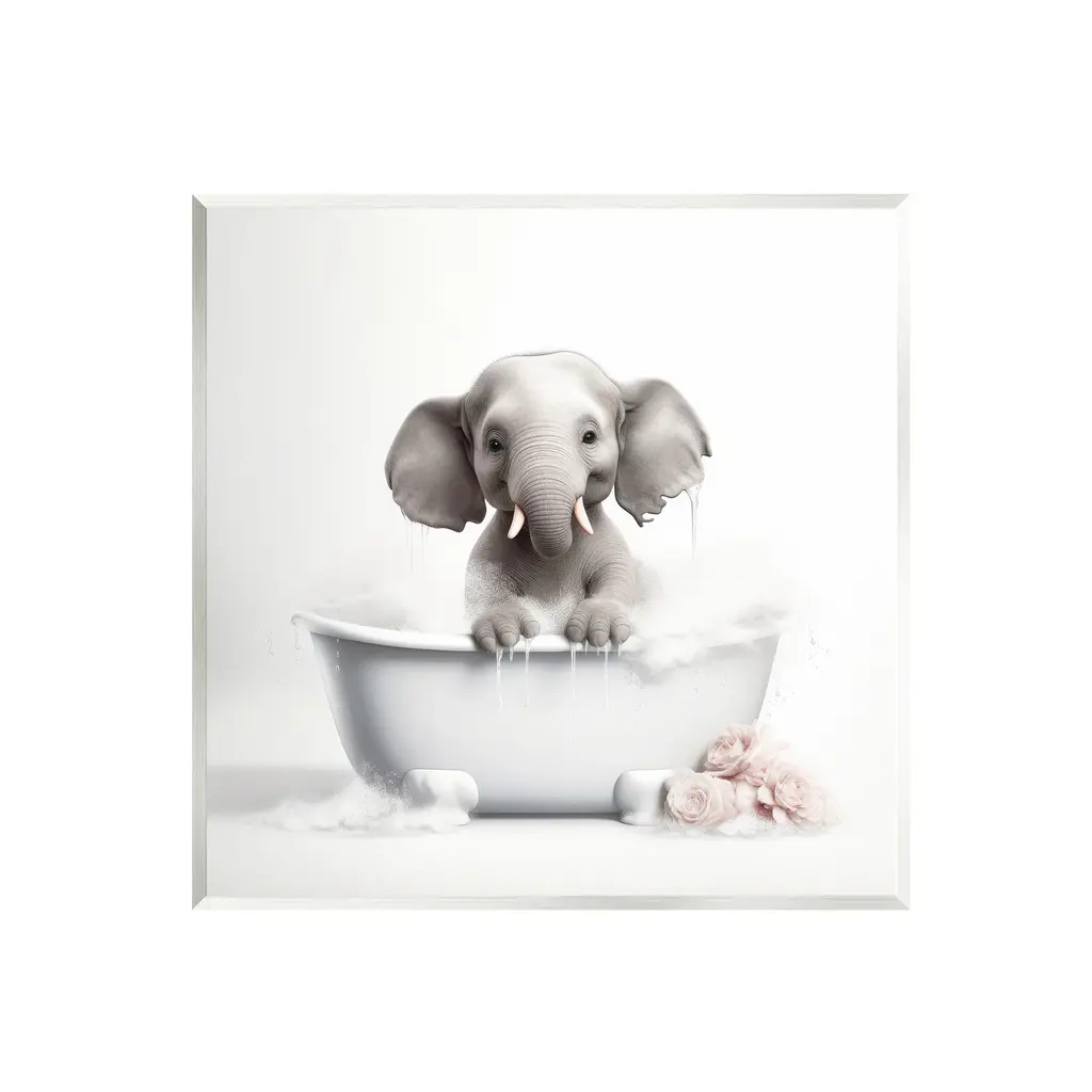 Our wall plaques start as high-quality lithograph prints mounted on durable 0.5-inch thick MDF wood. Each piece is hand finished and comes with a fresh layer of white foil on the sides to give it a crisp, clean look. Plaques arrive ready to hang without installation and come with removable plastic corners to keep them from damage in transit. Stupell Industries Wall Art is made in the USA.Features: Dimensions: 12 x 0.5 x 12 InchesWall Art is Ready to Hang with Hardware Free Hanging. No installation required. For Easy Set Up Lean or Layer Artwork on Shelf or Against Wall.All of our wall plaques start off as high quality lithograph prints that are then mounted on durable 0.5 inch thick MDF wood. Each piece is hand finished and comes with a fresh layer of foil on the sides to give it a crisp clean look. Made In USA.Artwork Relates To: Animal, Mammal, Wildlife, Bathroom, Elephant, BubblesDesign by Lazar Studio