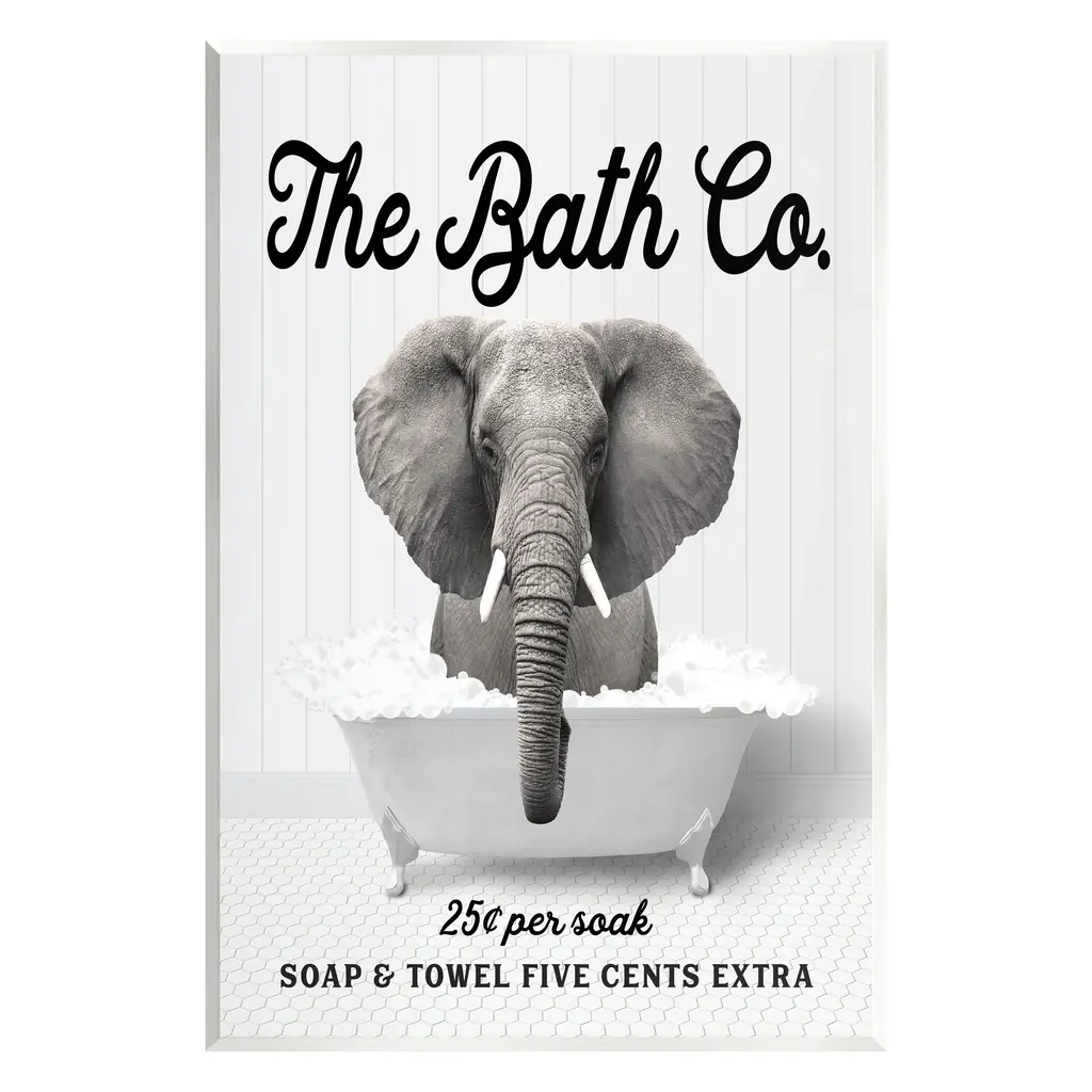 Our wall plaques start as high-quality lithograph prints mounted on durable 0.5-inch thick MDF wood. Each piece is hand finished and comes with a fresh layer of white foil on the sides to give it a crisp, clean look. Plaques arrive ready to hang without installation and come with removable plastic corners to keep them from damage in transit. Stupell Wall Art is made in the USA.Features: Dimensions: 10 x 0.5 x 15 InchesWall Plaque Sizes Include Standard: 10 x 0.5 x 15 Oversized: 13 x 0.5 x 19Wall Art is Ready to Hang with Hardware Free Hanging. No installation required. For Easy Set Up Lean or Layer Artwork on Shelf or Against Wall.All of our wall plaques start off as high quality lithograph prints that are then mounted on durable 0.5 inch thick MDF wood. Each piece is hand finished and comes with a fresh layer of foil on the sides to give it a crisp clean look. Made In USA.Artwork Relates To: Animal, Mammal, Wildlife, Bathroom, Rustic, Bathtub, The Bath Co, ElephantDesign by Lettered and Lined