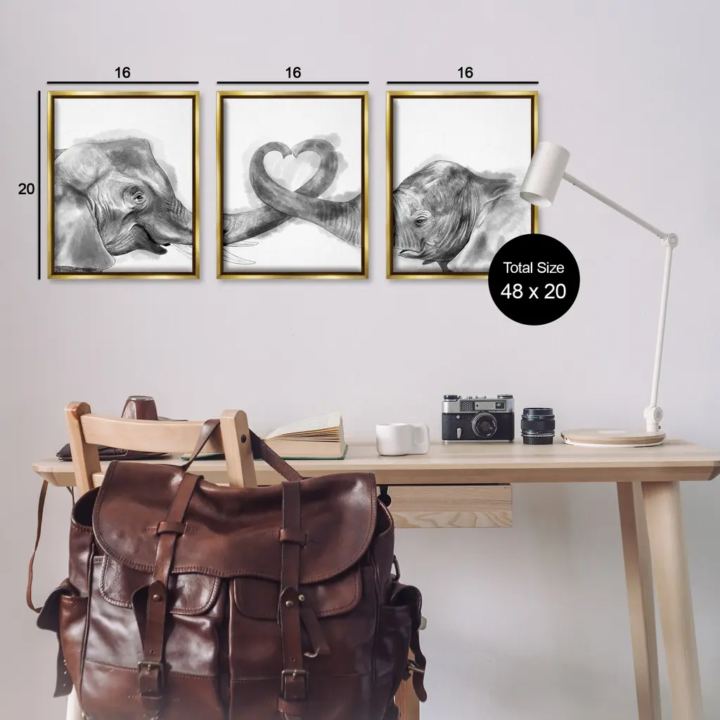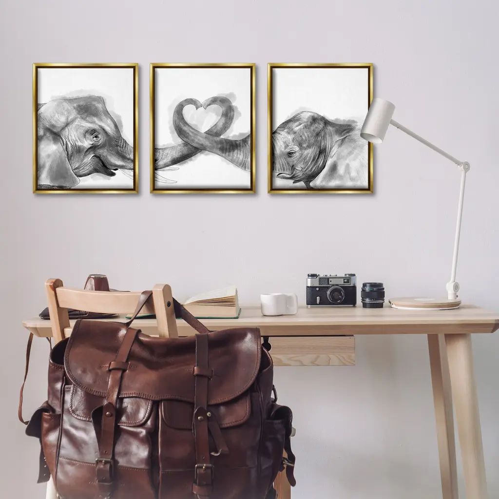 Elevate your home or office to the next level with Stupell Framed Floating Canvas Wall Art. Our premium hand-stretched canvas is mounted securely into a sturdy lightweight frame. The museum-style gap between the wrapped canvas and the box frame gives the illusion of floating artwork. Stupell Wall Art is made in the USA.Features: Dimensions: 3 Piece Set, Each Frame is 17 x 1.7 x 21Three Piece Floater Framed Canvas are available as 17x21 or 25x31 Panels. All Floater Frame Products have a 1.7" Depth.Wall Art is Ready to Hang with Hardware Free Hanging. No Installation required. For Easy Set Up Lean or Layer Artwork on Shelf or Against Wall. Artwork is Permently Fixed into the Frame.Our elevated 1.7" Thick Floating Frame is the perfect complement to our canvas style Wall Art. We use only the highest quality inks in house with industry leading printing solutions. Canvas is hand stretched over a durable wood foundation and then mounted securly into a Modern Box Frame. Made in the USA.Artwork Relates To: Animal, Wildlife, Abstract, Heart, Symbol, Love, ElephantDesign by Daphne Polselli