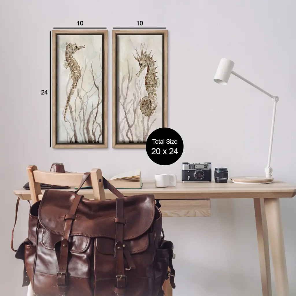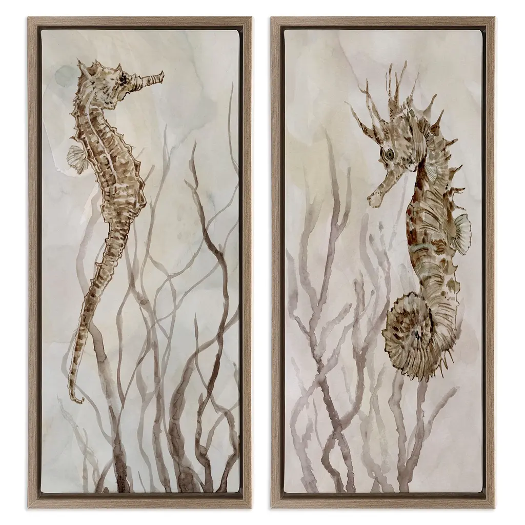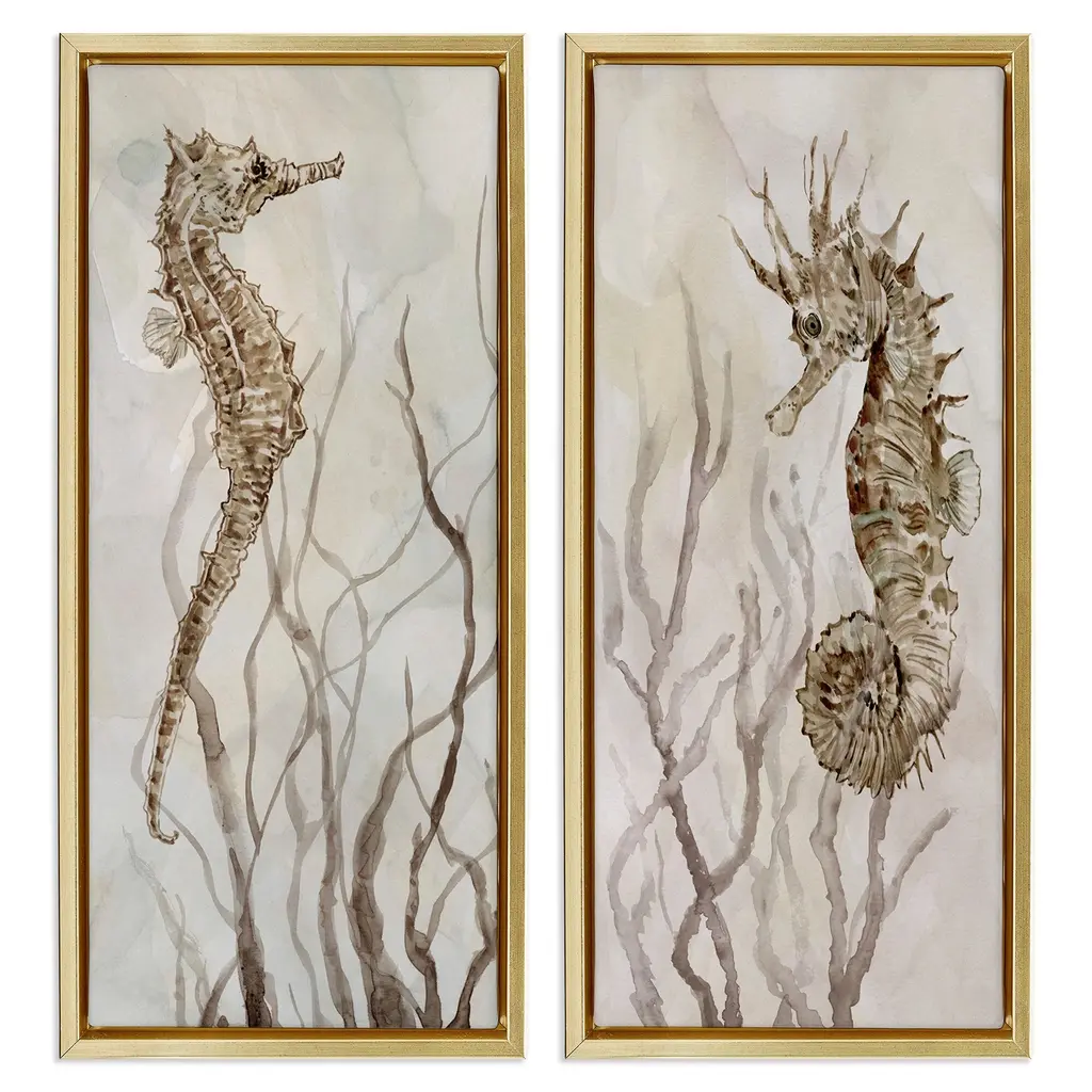 Elevate your home or office to the next level with Stupell Framed Floating Canvas Wall Art. Our premium hand-stretched canvas is mounted securely into a sturdy lightweight frame. The museum-style gap between the wrapped canvas and the box frame gives the illusion of floating artwork. Stupell Wall Art is made in the USA.Features: Dimensions: 2 Piece Set, Each Frame is 11 x 1.7 x 25Two Piece Floating Frame Canvas Products are available as 11"x25" or 14"x31" Panels. All Floating Frame Canvas Products have a 1.7" Depth.Wall Art is Ready to Hang with Hardware Free Hanging. No Installation required. For Easy Set Up Lean or Layer Artwork on Shelf or Against Wall. Artwork is Permently Fixed into the Frame.Our elevated 1.7" Thick Floating Frame is the perfect complement to our canvas style Wall Art. We use only the highest quality inks in house with industry leading printing solutions. Canvas is hand stretched over a durable wood foundation and then mounted securly into a Modern Box Frame. Made in the USA.Artwork Relates To: Modern, Seahorse, Sea Life, Seaweed, Ocean, CoralDesign by Carol Robinson