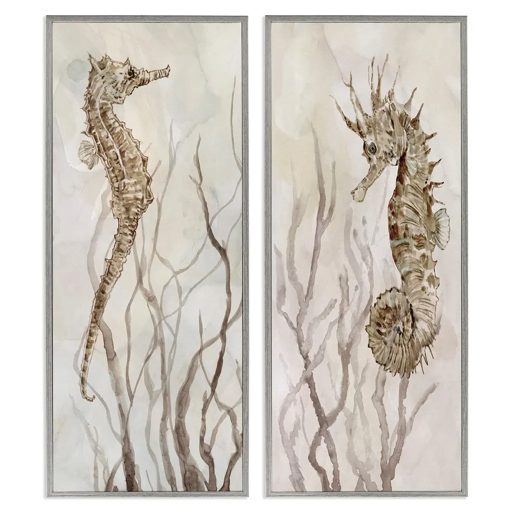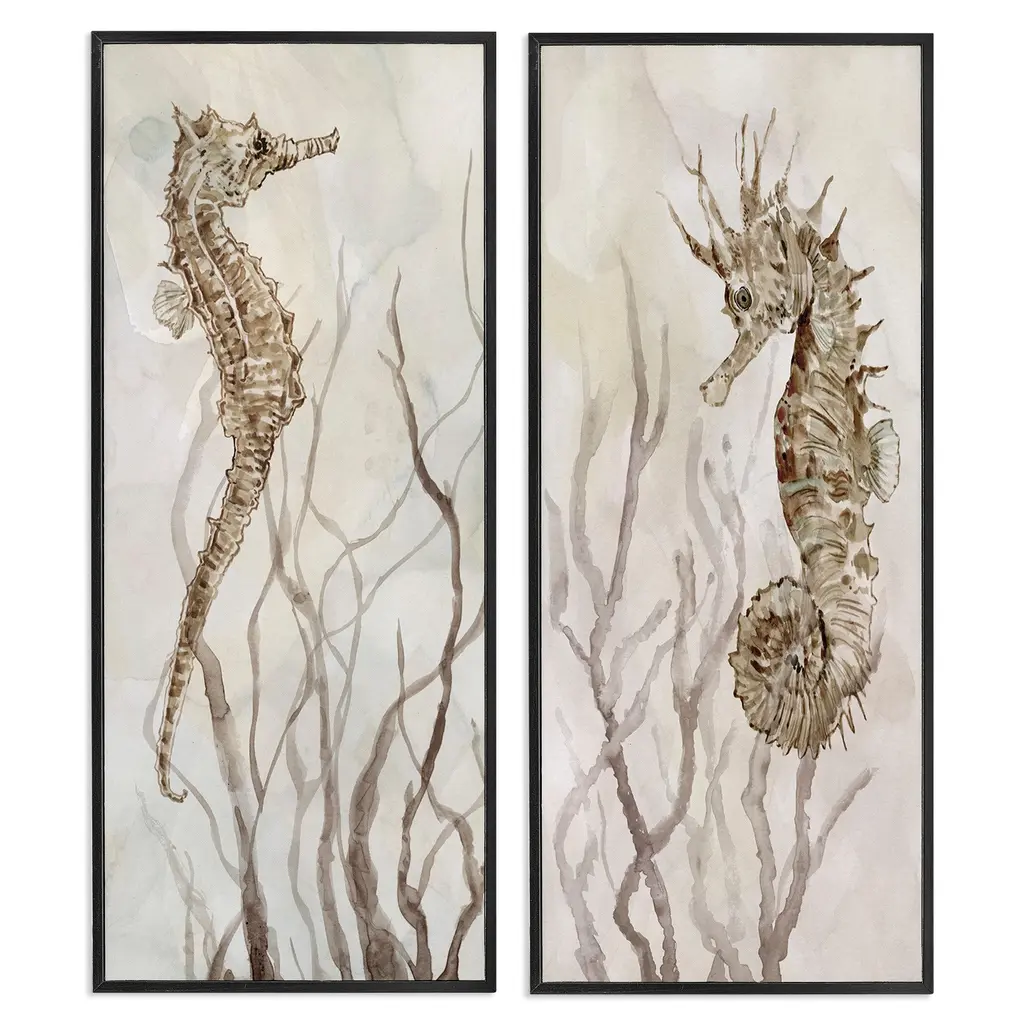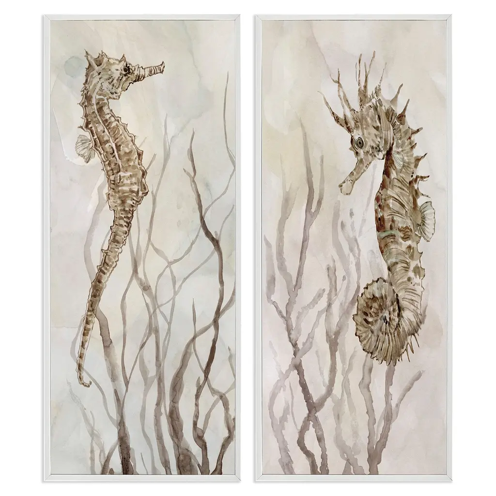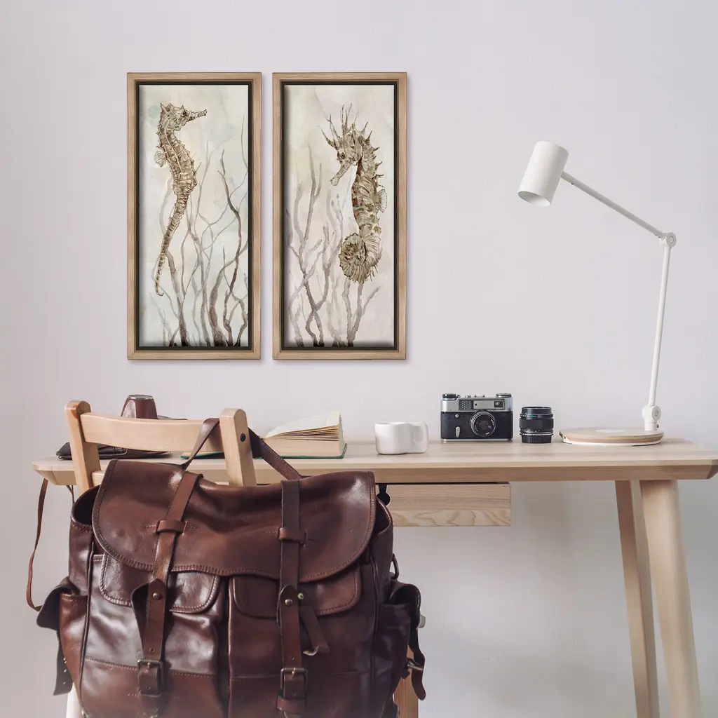 Elevate your home or office to the next level with Stupell Framed Floating Canvas Wall Art. Our premium hand-stretched canvas is mounted securely into a sturdy lightweight frame. The museum-style gap between the wrapped canvas and the box frame gives the illusion of floating artwork. Stupell Wall Art is made in the USA.Features: Dimensions: 2 Piece Set, Each Frame is 11 x 1.7 x 25Two Piece Floating Frame Canvas Products are available as 11"x25" or 14"x31" Panels. All Floating Frame Canvas Products have a 1.7" Depth.Wall Art is Ready to Hang with Hardware Free Hanging. No Installation required. For Easy Set Up Lean or Layer Artwork on Shelf or Against Wall. Artwork is Permently Fixed into the Frame.Our elevated 1.7" Thick Floating Frame is the perfect complement to our canvas style Wall Art. We use only the highest quality inks in house with industry leading printing solutions. Canvas is hand stretched over a durable wood foundation and then mounted securly into a Modern Box Frame. Made in the USA.Artwork Relates To: Modern, Seahorse, Sea Life, Seaweed, Ocean, CoralDesign by Carol Robinson