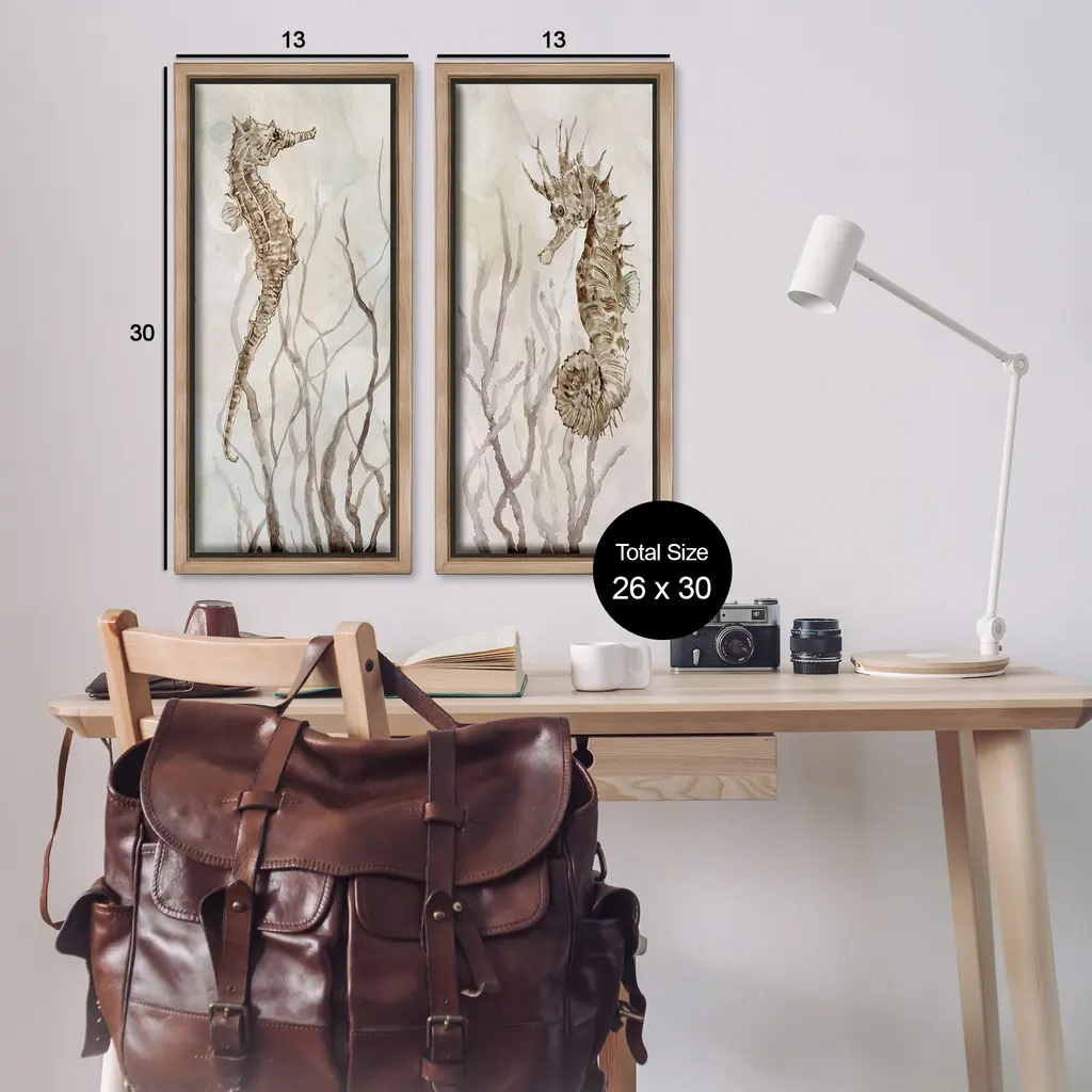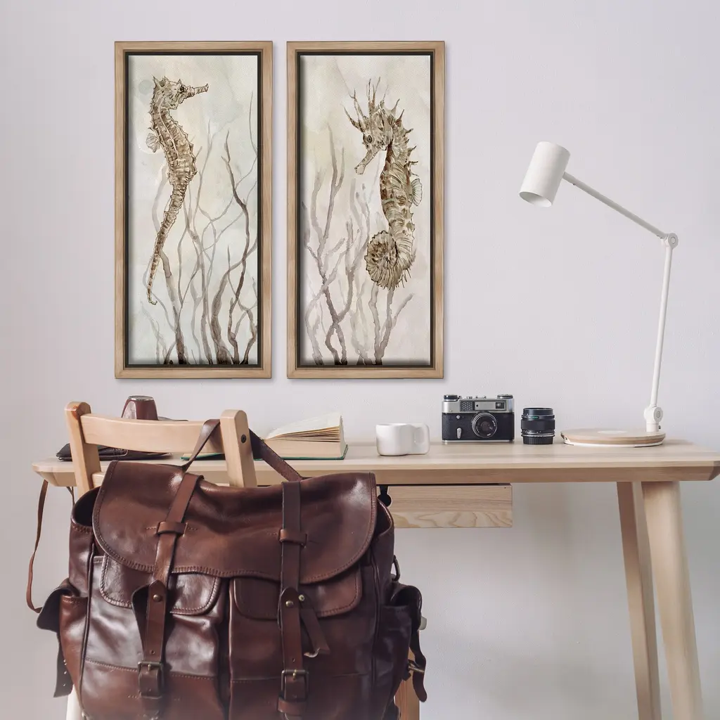 Elevate your home or office to the next level with Stupell Framed Floating Canvas Wall Art. Our premium hand-stretched canvas is mounted securely into a sturdy lightweight frame. The museum-style gap between the wrapped canvas and the box frame gives the illusion of floating artwork. Stupell Wall Art is made in the USA.Features: Dimensions: 2 Piece Set, Each Frame is 11 x 1.7 x 25Two Piece Floating Frame Canvas Products are available as 11"x25" or 14"x31" Panels. All Floating Frame Canvas Products have a 1.7" Depth.Wall Art is Ready to Hang with Hardware Free Hanging. No Installation required. For Easy Set Up Lean or Layer Artwork on Shelf or Against Wall. Artwork is Permently Fixed into the Frame.Our elevated 1.7" Thick Floating Frame is the perfect complement to our canvas style Wall Art. We use only the highest quality inks in house with industry leading printing solutions. Canvas is hand stretched over a durable wood foundation and then mounted securly into a Modern Box Frame. Made in the USA.Artwork Relates To: Modern, Seahorse, Sea Life, Seaweed, Ocean, CoralDesign by Carol Robinson