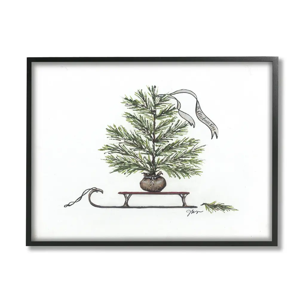 Stupell Endearing Christmas Fir Tree Sleigh Festive Ribbon Framed Wall Art - Green - 14 X 11 - Grey