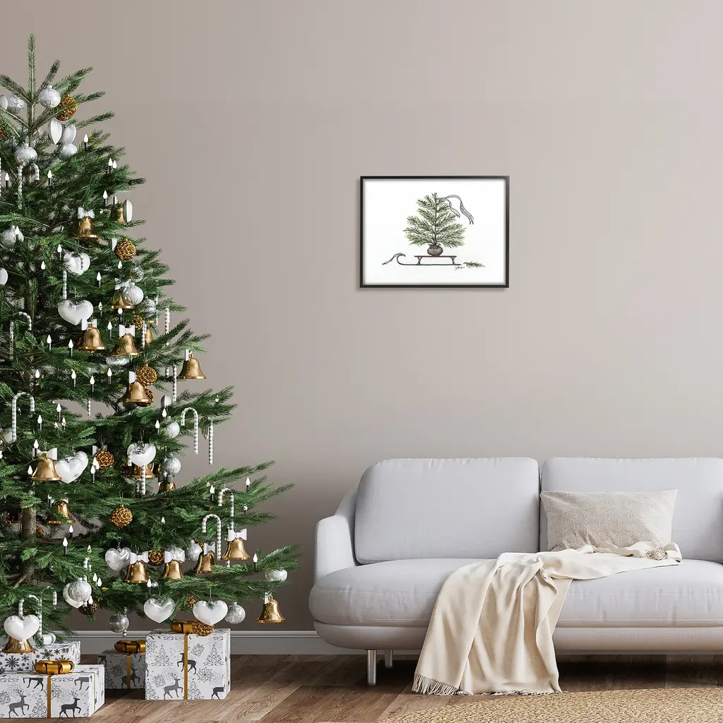 Stupell Endearing Christmas Fir Tree Sleigh Festive Ribbon Framed Wall Art - Green - 20 X 16 - Black