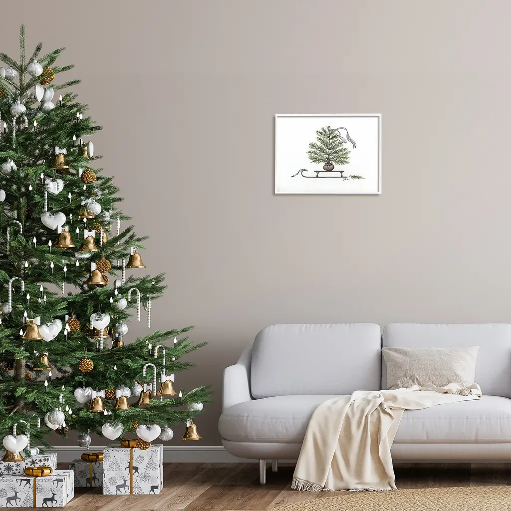 Stupell Endearing Christmas Fir Tree Sleigh Festive Ribbon Framed Wall Art - Green - 20 X 16 - White
