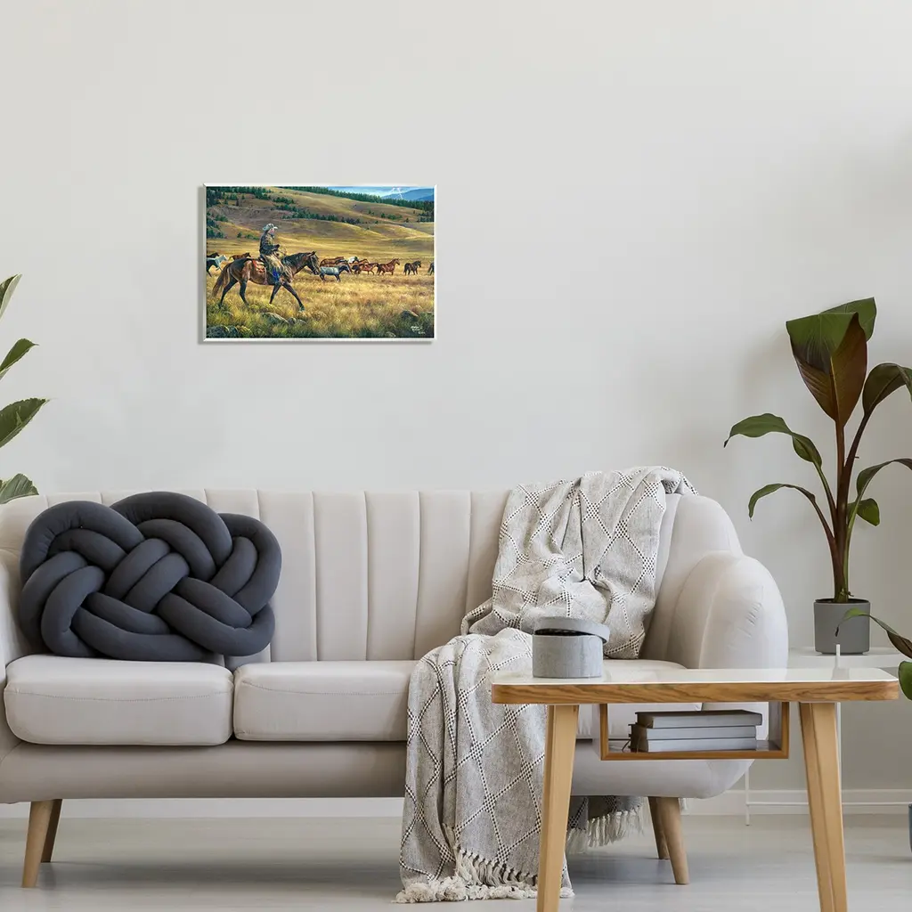 Our wall plaques start as high-quality lithograph prints mounted on durable 0.5-inch thick MDF wood. Each piece is hand finished and comes with a fresh layer of white foil on the sides to give it a crisp, clean look. Plaques arrive ready to hang without installation and come with removable plastic corners to keep them from damage in transit. Wall Art is made in the USA.Features: Dimensions: 15 x 0.5 x 10 InchesWall Plaque Sizes Include Standard: 15 x 0.5 x 10 Oversized: 19 x 0.5 x 13Wall Art is Ready to Hang with Hardware Free Hanging. No installation required. For Easy Set Up Lean or Layer Artwork on Shelf or Against Wall.All of our wall plaques start off as high quality lithograph prints that are then mounted on durable 0.5 inch thick MDF wood. Each piece is hand finished and comes with a fresh layer of foil on the sides to give it a crisp clean look. Made In USA.Artwork Relates To: Grassland, Nature, Person, Animal, Horse, Mammal, Countryside, Farm, Pasture, Rural, Ranch, Herd, EquestrianDesign by Abraham Hunter