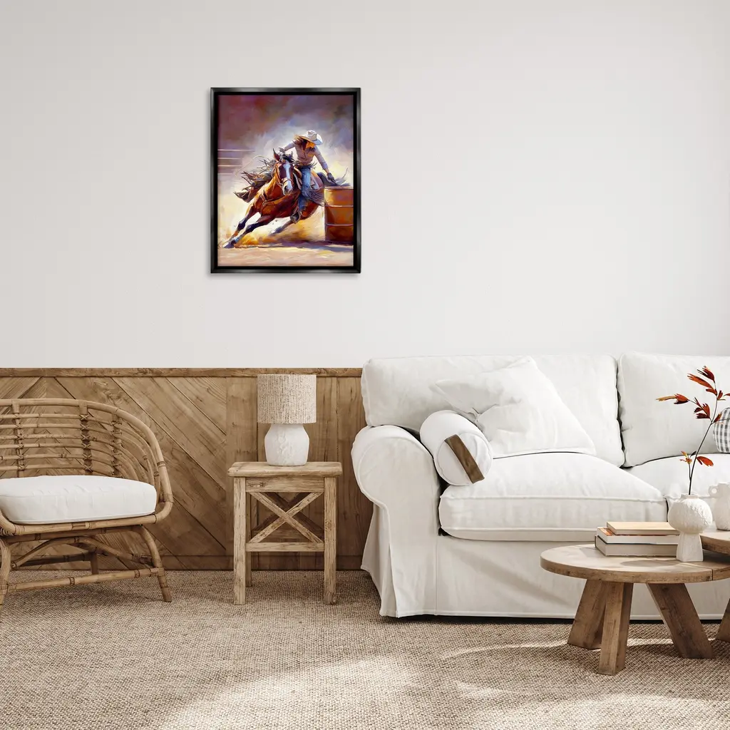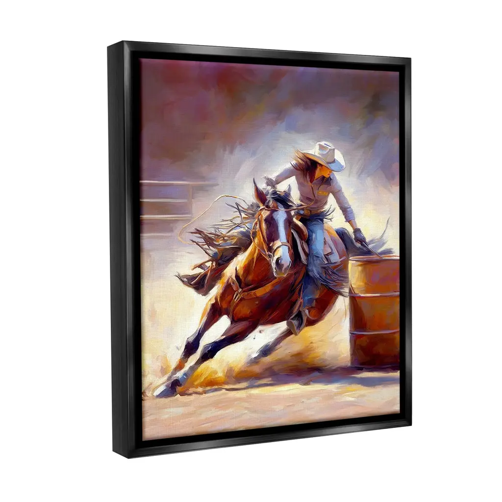 Elevate your home or office to the next level with Stupell Framed Floating Canvas Wall Art. Our premium hand-stretched canvas is mounted securely into a sturdy lightweight frame. The museum-style gap between the wrapped canvas and the box frame gives the illusion of floating artwork. Stupell Wall Art is made in the USA.Features: Dimensions: 17 x 1.7 x 21 Frame, 16 x 1.5 x 20 Canvas ArtFloating Frame Canvas Products are available in sizes 17"x21" and 25"x31". All Floating Frame Canvas Products have a 1.7" Depth.Wall Art is Ready to Hang with Hardware Free Hanging. No Installation required. For Easy Set Up Lean or Layer Artwork on Shelf or Against Wall. Artwork is Permently Fixed into the Frame.Our elevated 1.7" Thick Floating Frame is the perfect complement to our canvas style Wall Art. We use only the highest quality inks in house with industry leading printing solutions. Canvas is hand stretched over a durable wood foundation and then mounted securly into a Modern Box Frame. Made in the USA.Artwork Relates To: Equestrian, Rodeo, Country, Southwestern, Cowgirl, Animal, Horse, Racing, GallopingDesign by Ramona Murdock