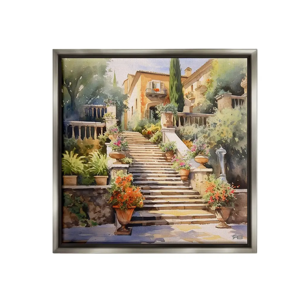 Elevate your home or office to the next level with Stupell Framed Floating Canvas Wall Art. Our premium hand-stretched canvas is mounted securely into a sturdy lightweight frame. The museum-style gap between the wrapped canvas and the box frame gives the illusion of floating artwork. Stupell Wall Art is made in the USA.Features: Dimensions: 18 x 1.7 x 18 Frame, 17 x 1.5 x 17 Canvas ArtFloating Frame Canvas Products are available in sizes 18"x18" and 25"x25". All Floating Frame Canvas Products have a 1.7" Depth.Wall Art is Ready to Hang with Hardware Free Hanging. No Installation required. For Easy Set Up Lean or Layer Artwork on Shelf or Against Wall. Artwork is Permently Fixed into the Frame.Our elevated 1.7" Thick Floating Frame is the perfect complement to our canvas style Wall Art. We use only the highest quality inks in house with industry leading printing solutions. Canvas is hand stretched over a durable wood foundation and then mounted securly into a Modern Box Frame. Made in the USA.Artwork Relates To: Architecture, Building, House, Villa, Staircase, Plant, Potted Plant, Hacienda, Garden, Nature, City, Road, Street, Flower, Cottage, Town, EuropeanDesign by RB