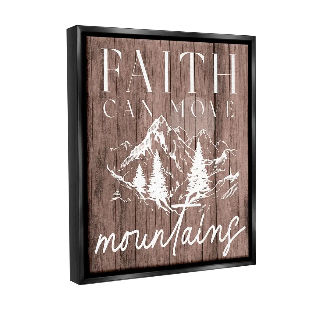 Elevate your home or office to the next level with Stupell Framed Floating Canvas Wall Art. Our premium hand-stretched canvas is mounted securely into a sturdy lightweight frame. The museum-style gap between the wrapped canvas and the box frame gives the illusion of floating artwork. Stupell Wall Art is made in the USA.Features: Dimensions: 17 x 1.7 x 21 Frame, 16 x 1.5 x 20 Canvas ArtFloating Frame Canvas Products are available in sizes 17"x21" and 25"x31". All Floating Frame Canvas Products have a 1.7" Depth.Wall Art is Ready to Hang with Hardware Free Hanging. No Installation required. For Easy Set Up Lean or Layer Artwork on Shelf or Against Wall. Artwork is Permently Fixed into the Frame.Our elevated 1.7" Thick Floating Frame is the perfect complement to our canvas style Wall Art. We use only the highest quality inks in house with industry leading printing solutions. Canvas is hand stretched over a durable wood foundation and then mounted securly into a Modern Box Frame. Made in the USA.Artwork Relates To: Rustic, Woodland, Forest, Cabin, Lodge, Faith, Mountain, Tree, Inspirational, Faith Can Move MountainsDesign by Lil' Rue