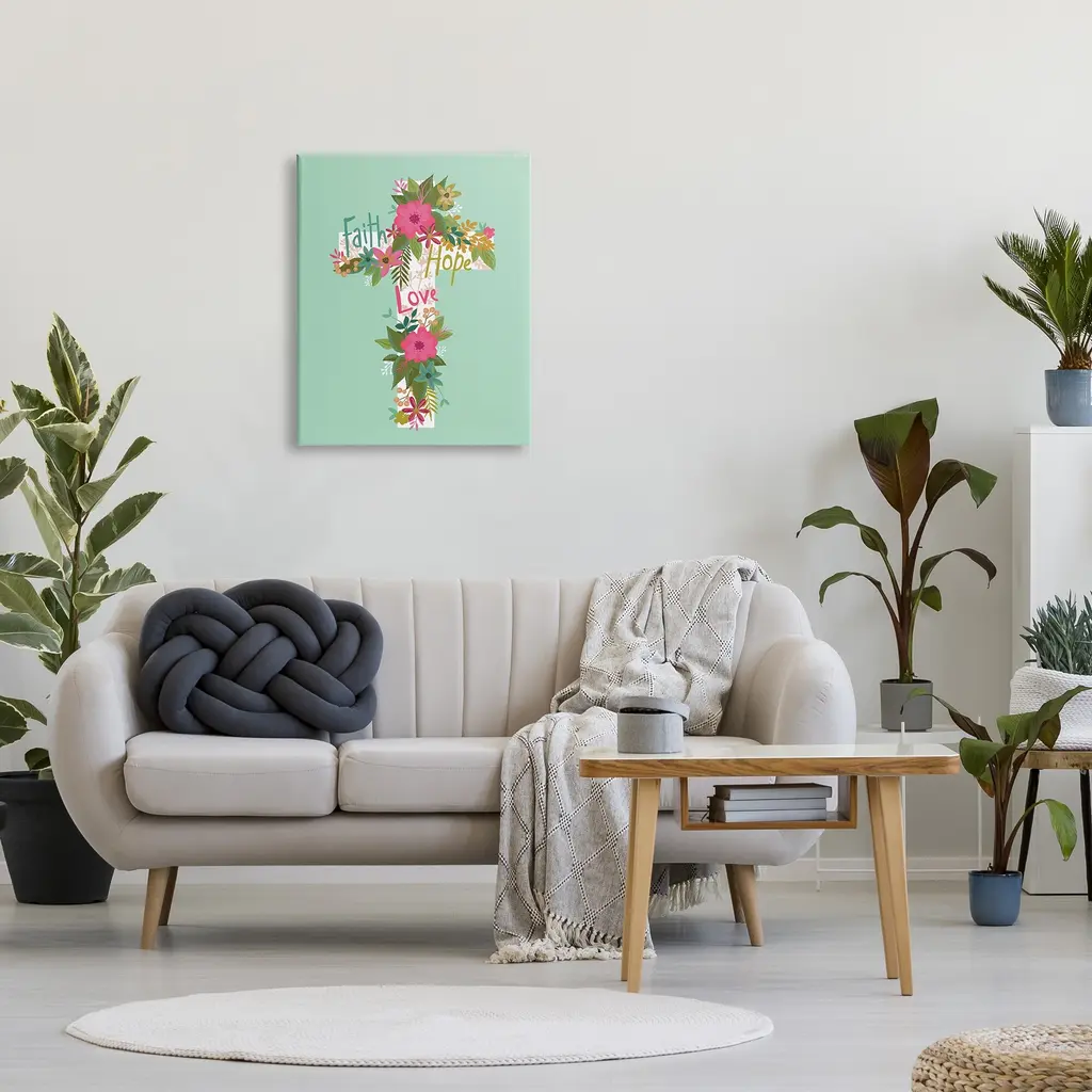We create our stretched canvas to the highest standards. Using only the highest quality inks and canvas on Mimaki printers, we hand-cut and stretch each piece over a 1.5-inch thick wooden frame for hanging. As a result, the art comes ready to hang on the sturdy ledge with no installation required. Stupell Wall Art is made in the USA.Features: Dimensions: 16 x 1.5 x 20 InchesStretched Canvas Sizes Include Standard: 16 x 1.5 x 20 Large: 20 x 1.5 x 30 X-Large: 30 x 1.5 x 40 Oversized: 36 x 1.5 x 48Wall Art is Ready to Hang - No Installation or Hardware Needed. For Easy Set Up Lean or Layer Artwork on Shelf or Against Wall.Our stretched canvas is created with the highest standards. We use only the highest quality inks and canvas on our in house Mimaki printers, and then hand cut and stretch each piece over a 1.5 inch thick wooden frame for hanging. Made In USA.Artwork Relates To: Floral, Flower, Blossom, Cross, Spiritual, Religious, Faith Hope LoveDesign by Lisa Perry Whitebutton