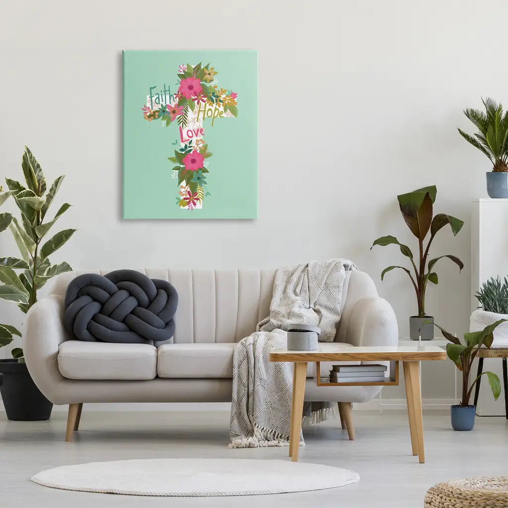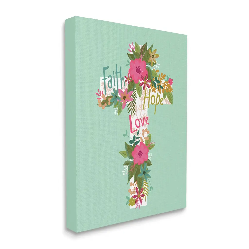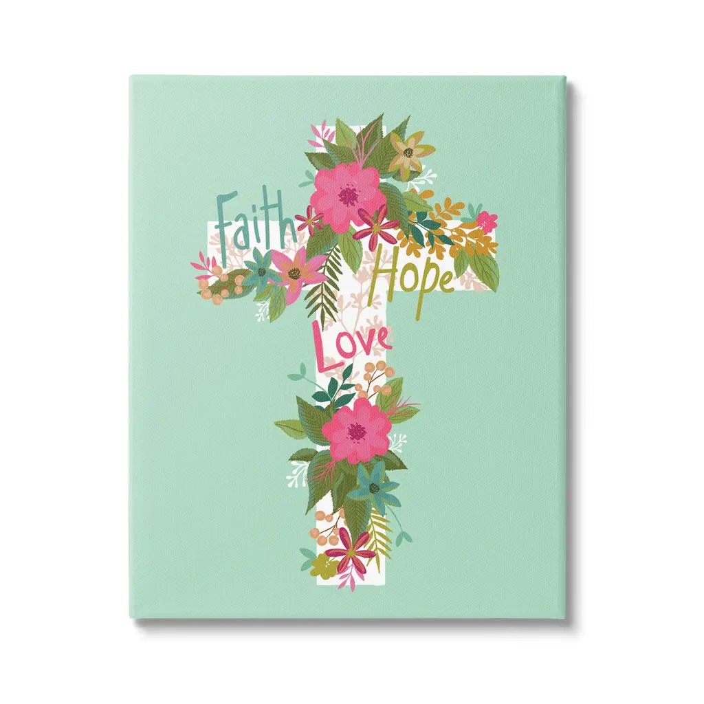 We create our stretched canvas to the highest standards. Using only the highest quality inks and canvas on Mimaki printers, we hand-cut and stretch each piece over a 1.5-inch thick wooden frame for hanging. As a result, the art comes ready to hang on the sturdy ledge with no installation required. Stupell Wall Art is made in the USA.Features: Dimensions: 16 x 1.5 x 20 InchesStretched Canvas Sizes Include Standard: 16 x 1.5 x 20 Large: 20 x 1.5 x 30 X-Large: 30 x 1.5 x 40 Oversized: 36 x 1.5 x 48Wall Art is Ready to Hang - No Installation or Hardware Needed. For Easy Set Up Lean or Layer Artwork on Shelf or Against Wall.Our stretched canvas is created with the highest standards. We use only the highest quality inks and canvas on our in house Mimaki printers, and then hand cut and stretch each piece over a 1.5 inch thick wooden frame for hanging. Made In USA.Artwork Relates To: Floral, Flower, Blossom, Cross, Spiritual, Religious, Faith Hope LoveDesign by Lisa Perry Whitebutton