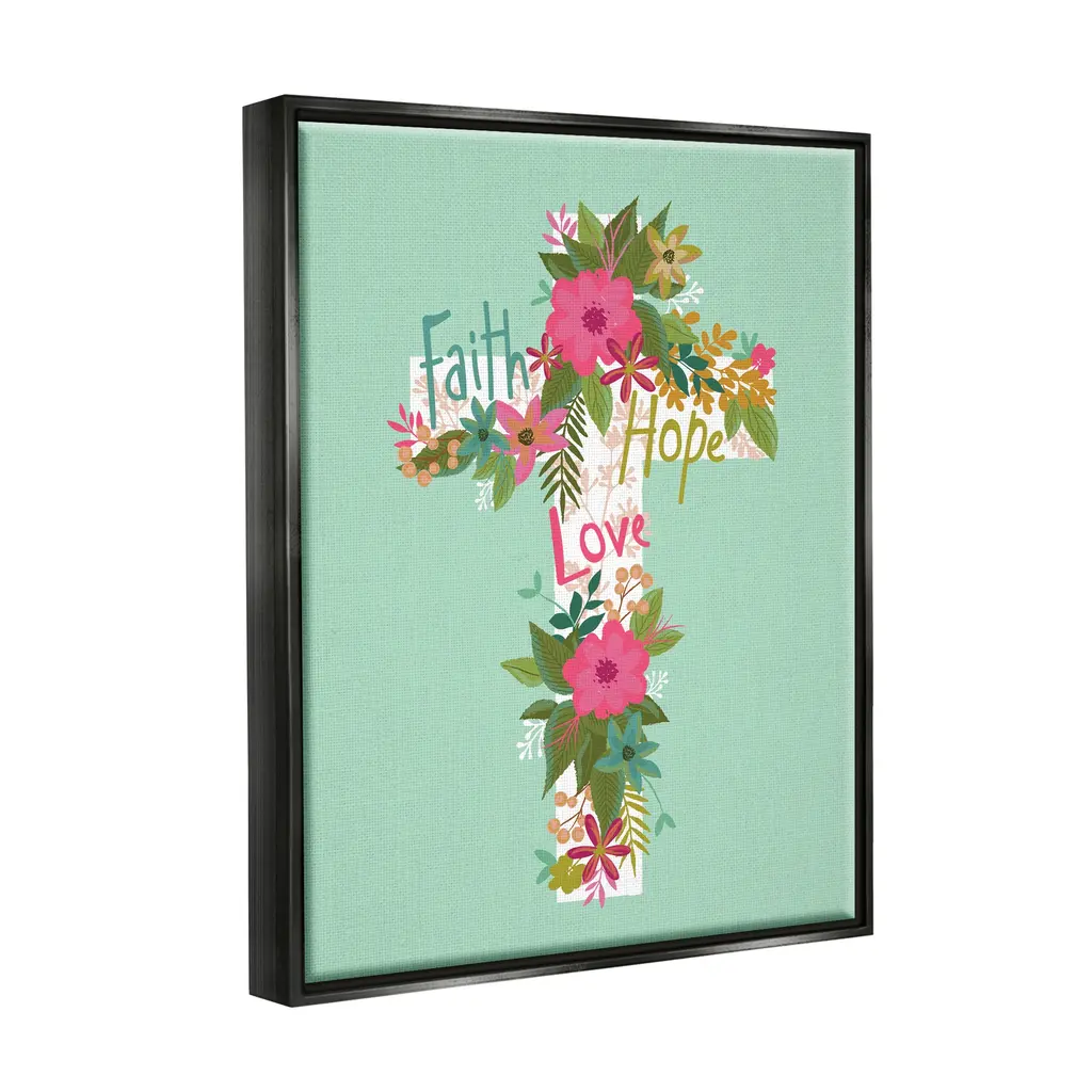 Elevate your home or office to the next level with Stupell Framed Floating Canvas Wall Art. Our premium hand-stretched canvas is mounted securely into a sturdy lightweight frame. The museum-style gap between the wrapped canvas and the box frame gives the illusion of floating artwork. Stupell Wall Art is made in the USA.Features: Dimensions: 17 x 1.7 x 21 Frame, 16 x 1.5 x 20 Canvas ArtFloating Frame Sizes Include Standard: 17 x 1.7 x 21 Oversized: 25 x 1.7 x 31Wall Art is Ready to Hang - No Installation or Hardware Needed. For Easy Set Up Lean or Layer Artwork on Shelf or Against Wall.Our elevated 1.7" Thick Floating Frame is the perfect complement to our canvas style Wall Art. We use only the highest quality inks in house with industry leading printing solutions. Canvas is hand stretched over a durable wood foundation and then mounted securly into a Modern Box Frame. Made in the USA.Artwork Relates To: Floral, Flower, Blossom, Cross, Spiritual, Religious, Faith Hope LoveDesign by Lisa Perry Whitebutton