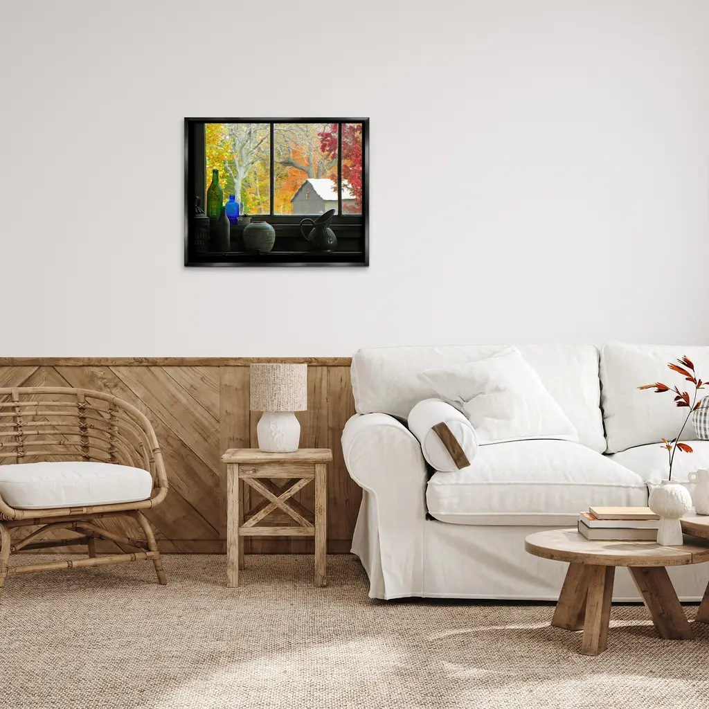 Elevate your home or office to the next level with Stupell Framed Floating Canvas Wall Art. Our premium hand-stretched canvas is mounted securely into a sturdy lightweight frame. The museum-style gap between the wrapped canvas and the box frame gives the illusion of floating artwork. Stupell Wall Art is made in the USA.Features: Dimensions: 21 x 1.7 x 17 Frame, 20 x 1.5 x 16 Canvas ArtFloating Frame Canvas Products are available in sizes 21"x17" and 31"x25". All Floating Frame Canvas Products have a 1.7" Depth.Wall Art is Ready to Hang with Hardware Free Hanging. No Installation required. For Easy Set Up Lean or Layer Artwork on Shelf or Against Wall. Artwork is Permently Fixed into the Frame.Our elevated 1.7" Thick Floating Frame is the perfect complement to our canvas style Wall Art. We use only the highest quality inks in house with industry leading printing solutions. Canvas is hand stretched over a durable wood foundation and then mounted securly into a Modern Box Frame. Made in the USA.Artwork Relates To: Window, Windowsill, Jug, Pottery, Plant, Tree, Vase, Glass, Bottle, Foliage, Fall, Autumn, Country, Cabin, NatureDesign by GraffiTee Studios