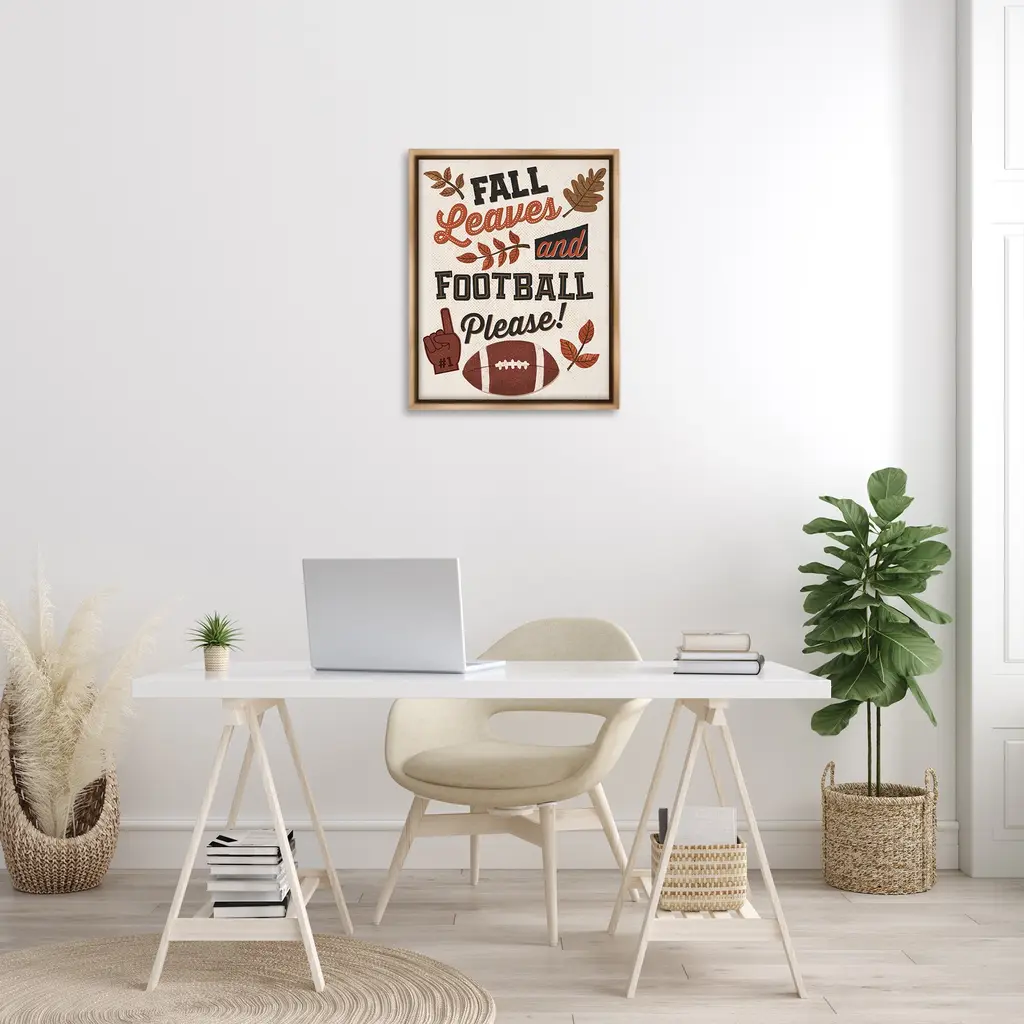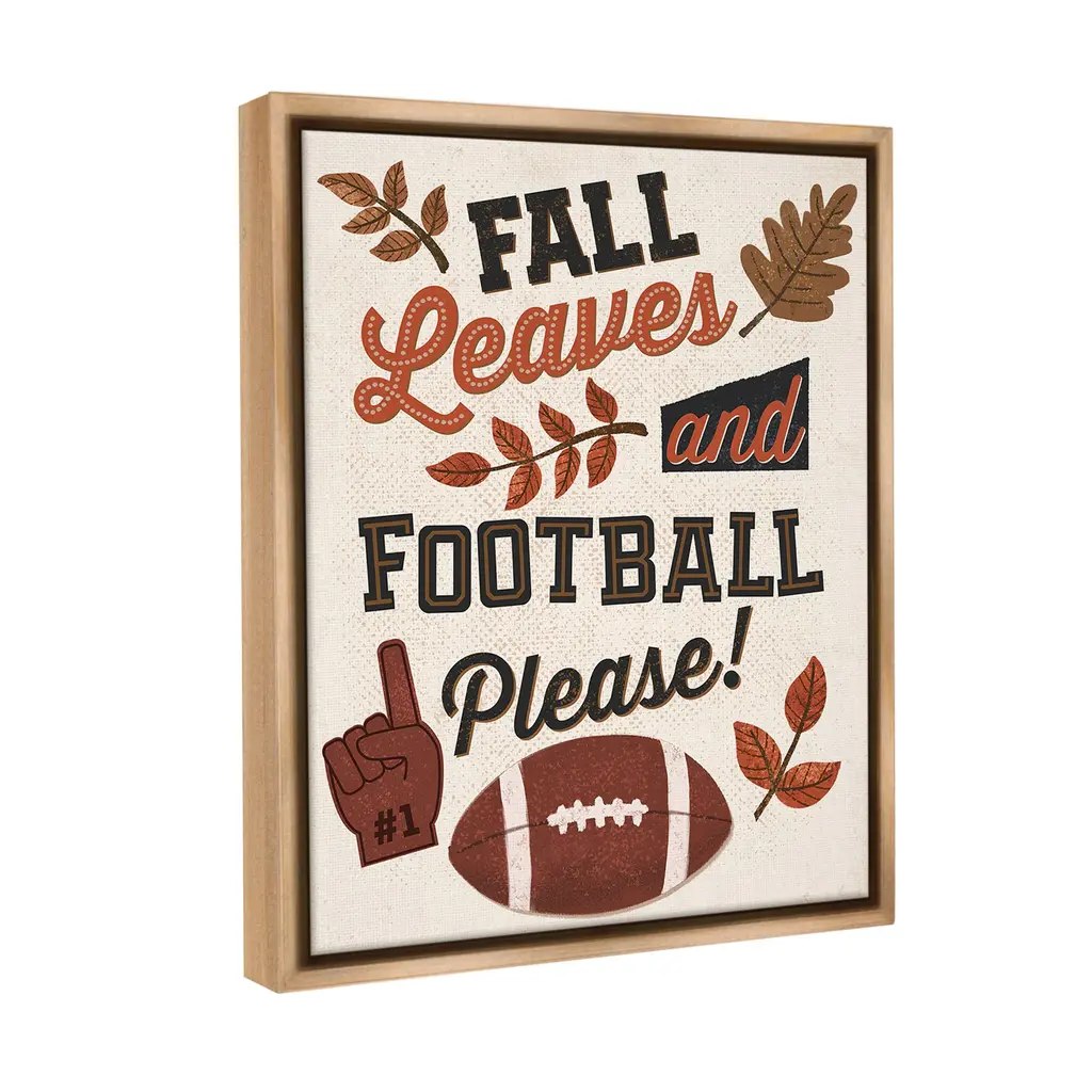 Elevate your home or office to the next level with Stupell Framed Floating Canvas Wall Art. Our premium hand-stretched canvas is mounted securely into a sturdy lightweight frame. The museum-style gap between the wrapped canvas and the box frame gives the illusion of floating artwork. Stupell Wall Art is made in the USA.Features: Dimensions: 17 x 1.7 x 21 Frame, 16 x 1.5 x 20 Canvas ArtFloating Frame Canvas Products are available in sizes 17"x21" and 25"x31". All Floating Frame Canvas Products have a 1.7" Depth.Wall Art is Ready to Hang with Hardware Free Hanging. No Installation required. For Easy Set Up Lean or Layer Artwork on Shelf or Against Wall. Artwork is Permently Fixed into the Frame.Our elevated 1.7" Thick Floating Frame is the perfect complement to our canvas style Wall Art. We use only the highest quality inks in house with industry leading printing solutions. Canvas is hand stretched over a durable wood foundation and then mounted securly into a Modern Box Frame. Made in the USA.Artwork Relates To: American Football, Ball, Football, Sport, Leaf, Plant, Autumn, Fall, Pattern, Fall Leaves and Football PleasDesign by Diane Labombarbe