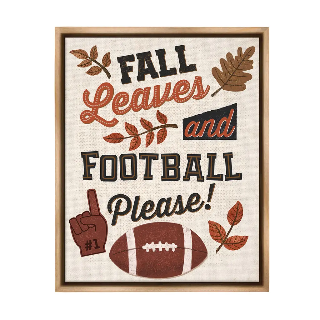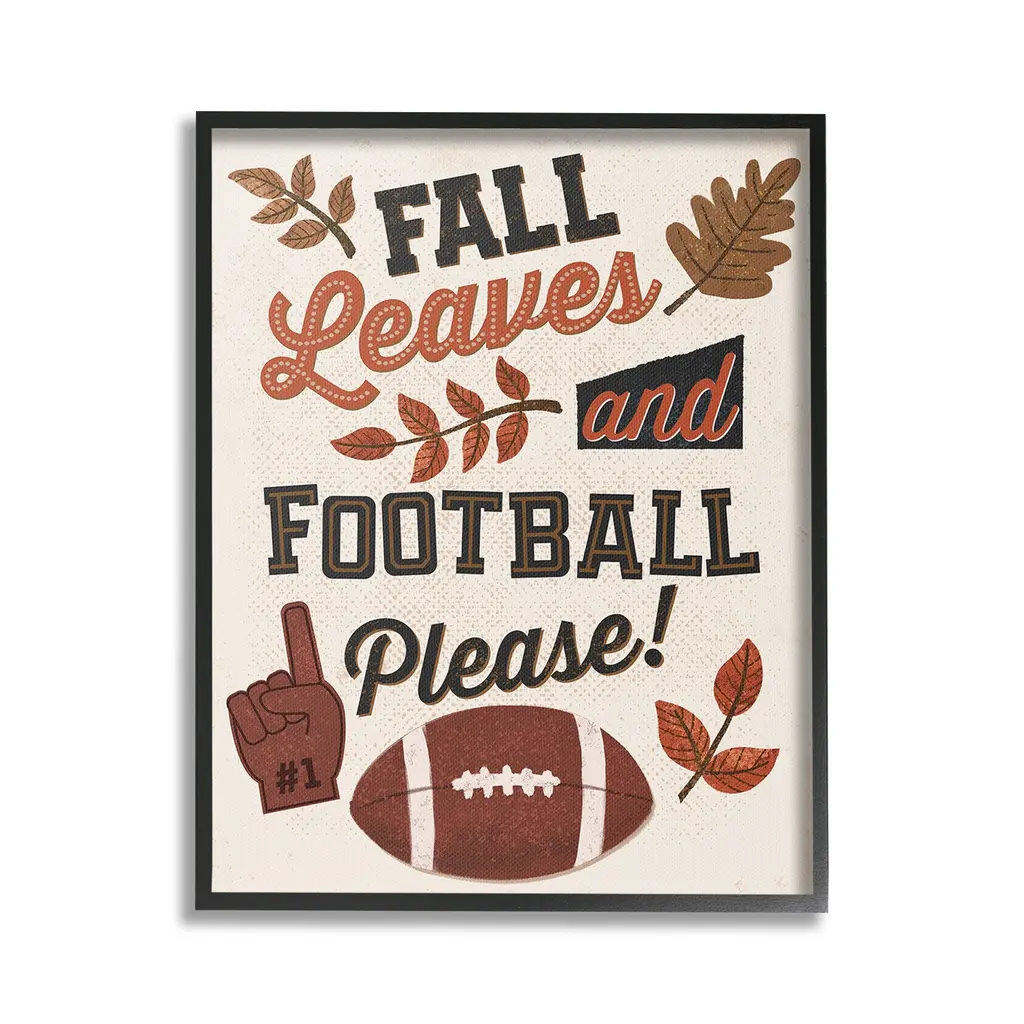 Add dimension to any room with our textured Framed Giclee Artwork. Our framed artwork is securely mounted into a 1.5-inch thick wood grain frame and ready to hang. Frames are available in three alluring styles: black, gray farmhouse and white. In addition, you should check out our oversized options if you want a statement piece. Stupell Wall Art is made in the USA.Features: Dimensions: 11 x 1.5 x 14 FramedFramed Giclee Products are available in the sizes 11"x14", 16"x20" or 24"x30". All Framed Giclee Products have a 1.5" Depth. Wall Art is Ready to Hang with Hardware Free Hanging. No installation required. For Easy Set Up Lean or Layer Artwork on Shelf or Against Wall.Our giclée prints are carefully mounted on a durable MDF backing, and then perfectly finished in a 1.5 inch thick woodgrain frame. Mounted frame colors include black, gray farmhouse and white. Made In USA.Artwork Relates To: American Football, Ball, Football, Sport, Leaf, Plant, Autumn, Fall, Pattern, Fall Leaves and Football PleasDesign by Diane Labombarbe