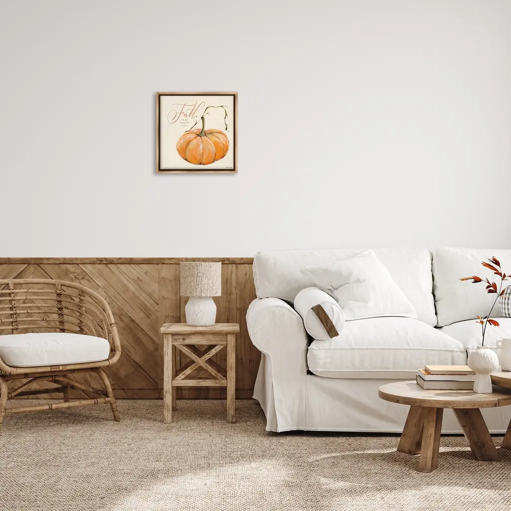 Elevate your home or office to the next level with Stupell Framed Floating Canvas Wall Art. Our premium hand-stretched canvas is mounted securely into a sturdy lightweight frame. The museum-style gap between the wrapped canvas and the box frame gives the illusion of floating artwork. Stupell Wall Art is made in the USA.Features: Dimensions: 18 x 1.7 x 18 Frame, 17 x 1.5 x 17 Canvas ArtFloating Frame Canvas Products are available in sizes 18"x18" and 25"x25". All Floating Frame Canvas Products have a 1.7" Depth.Wall Art is Ready to Hang with Hardware Free Hanging. No Installation required. For Easy Set Up Lean or Layer Artwork on Shelf or Against Wall. Artwork is Permently Fixed into the Frame.Our elevated 1.7" Thick Floating Frame is the perfect complement to our canvas style Wall Art. We use only the highest quality inks in house with industry leading printing solutions. Canvas is hand stretched over a durable wood foundation and then mounted securly into a Modern Box Frame. Made in the USA.Artwork Relates To: Seasonal, Fall, Autumn, Pumpkin, PhraseDesign by Stephanie Workman Marrott